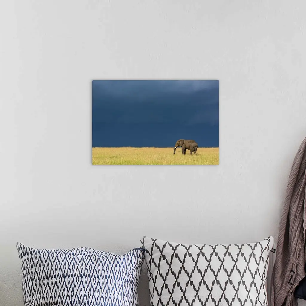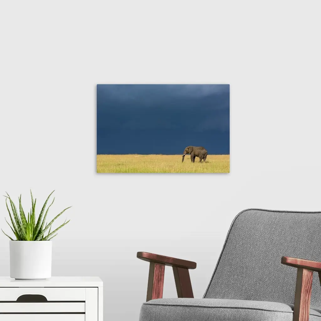 African bush elephant (Loxodonta africana) stands in grass beneath dark clouds, Serengeti National Park; Tanzania