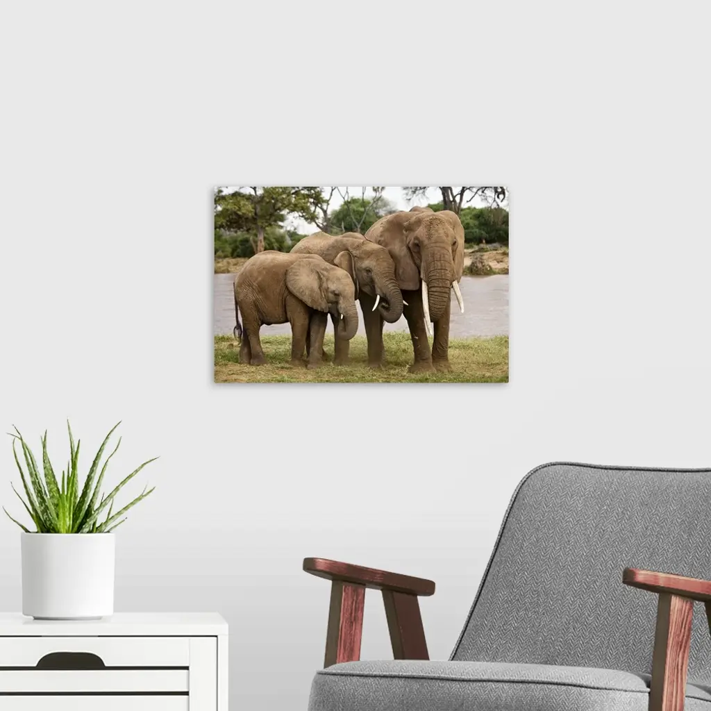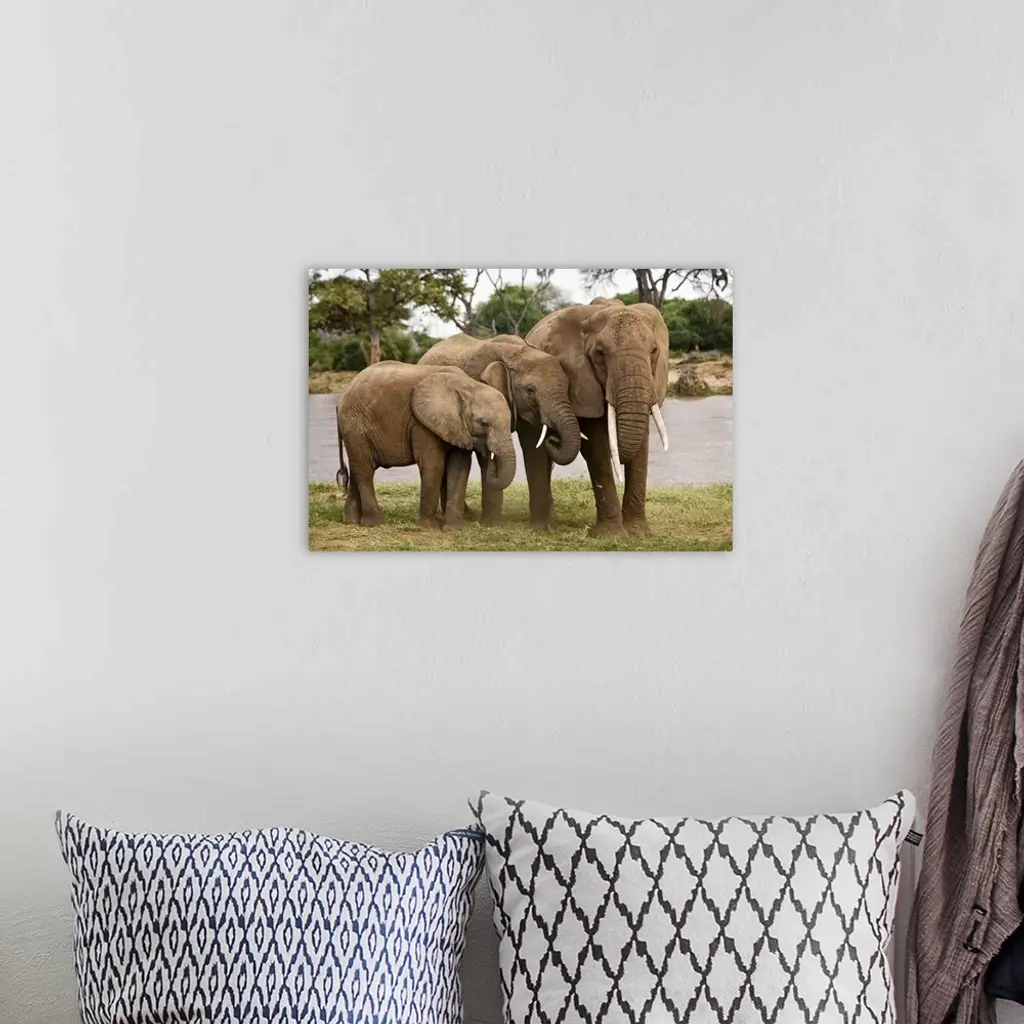 Wildlife photograph of three elephants standing close together on the African plains.