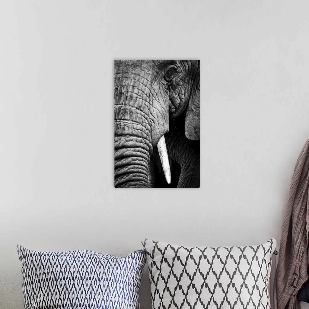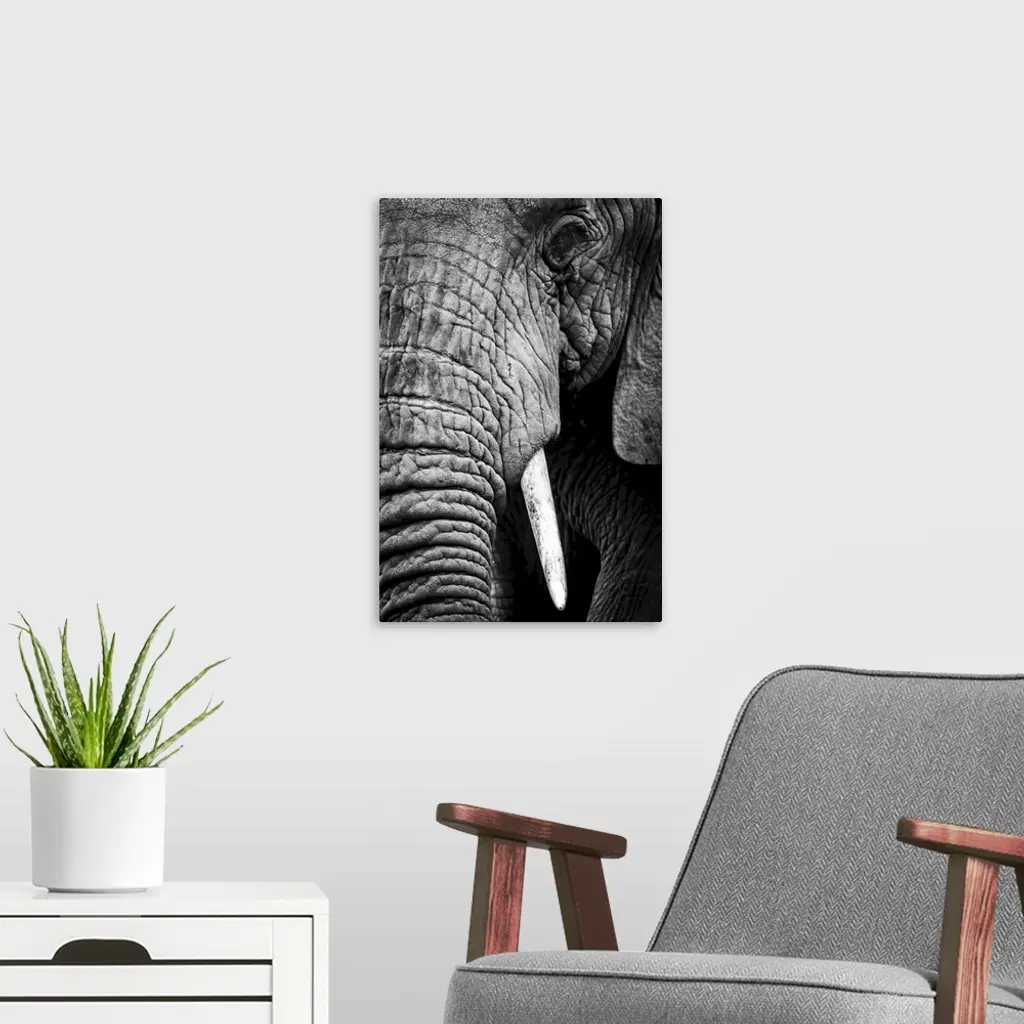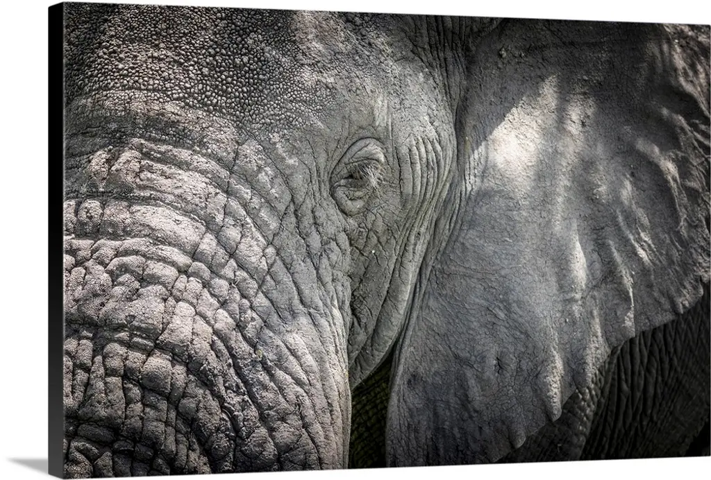 An African elephant (loxodonta africana) stares at the camera, showing its wrinkled skin, long trunk and left eye and tusk, ngorongoro crater, Tanzania.