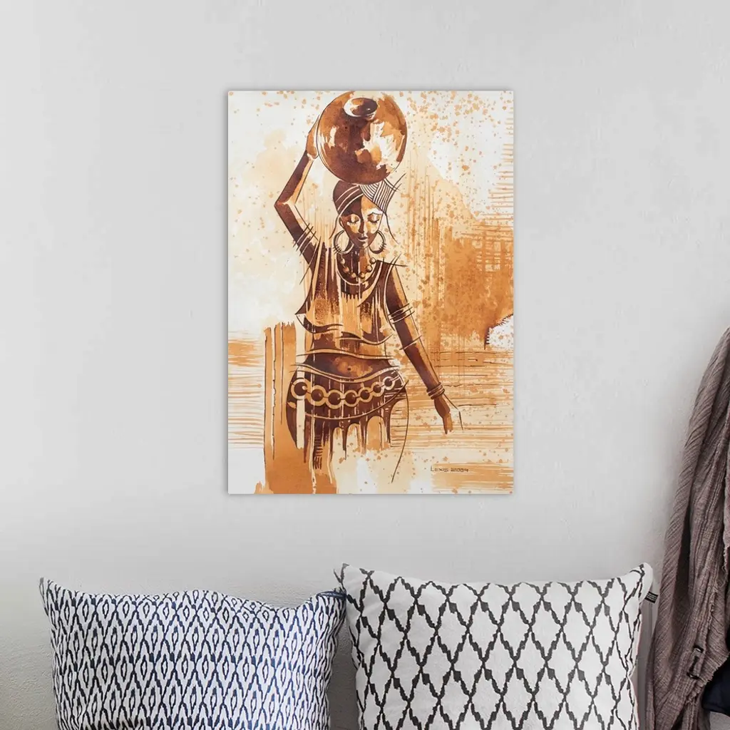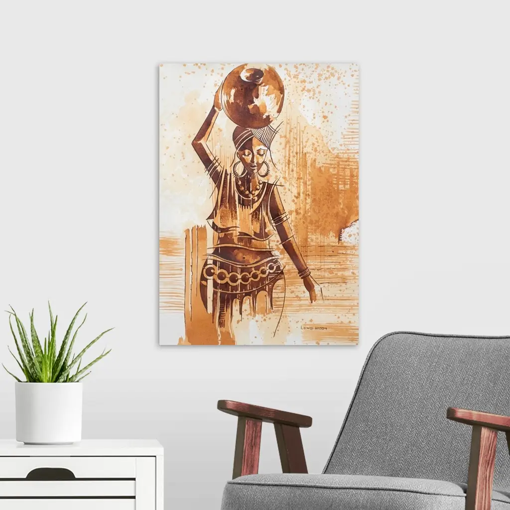 Like African women, never forget to wear a smile as you carry out your duties, for you may never know its impact on people's lives, advices Alex Mensah. He masterfully captures both her inner and outer beauty in this expressive composition. To paint her portrait he prepares aciduro by soaking rusted nails. The resulting tinted liquid is very similar to watercolors.