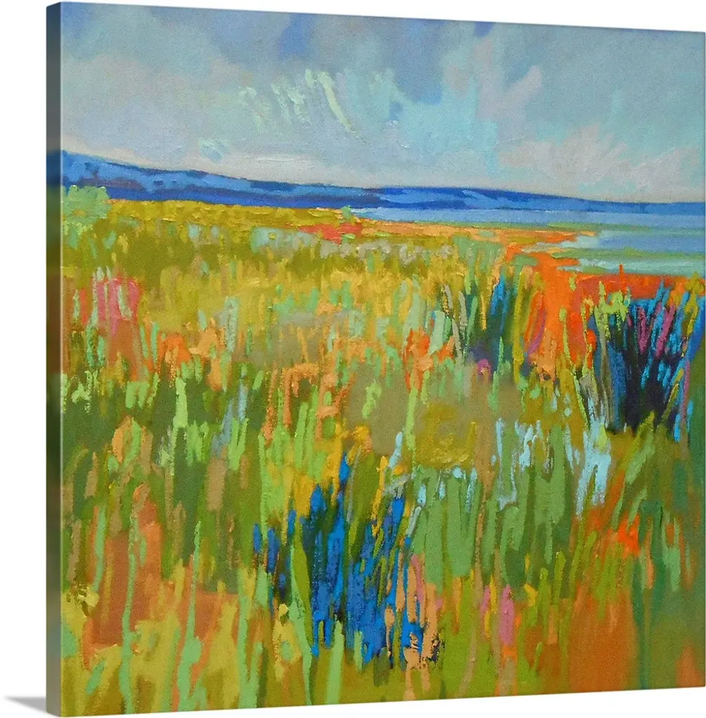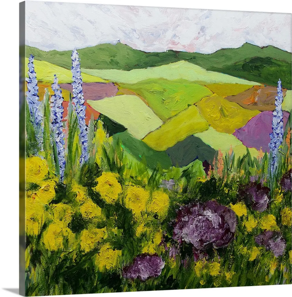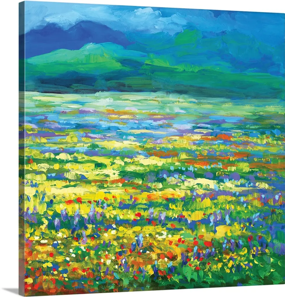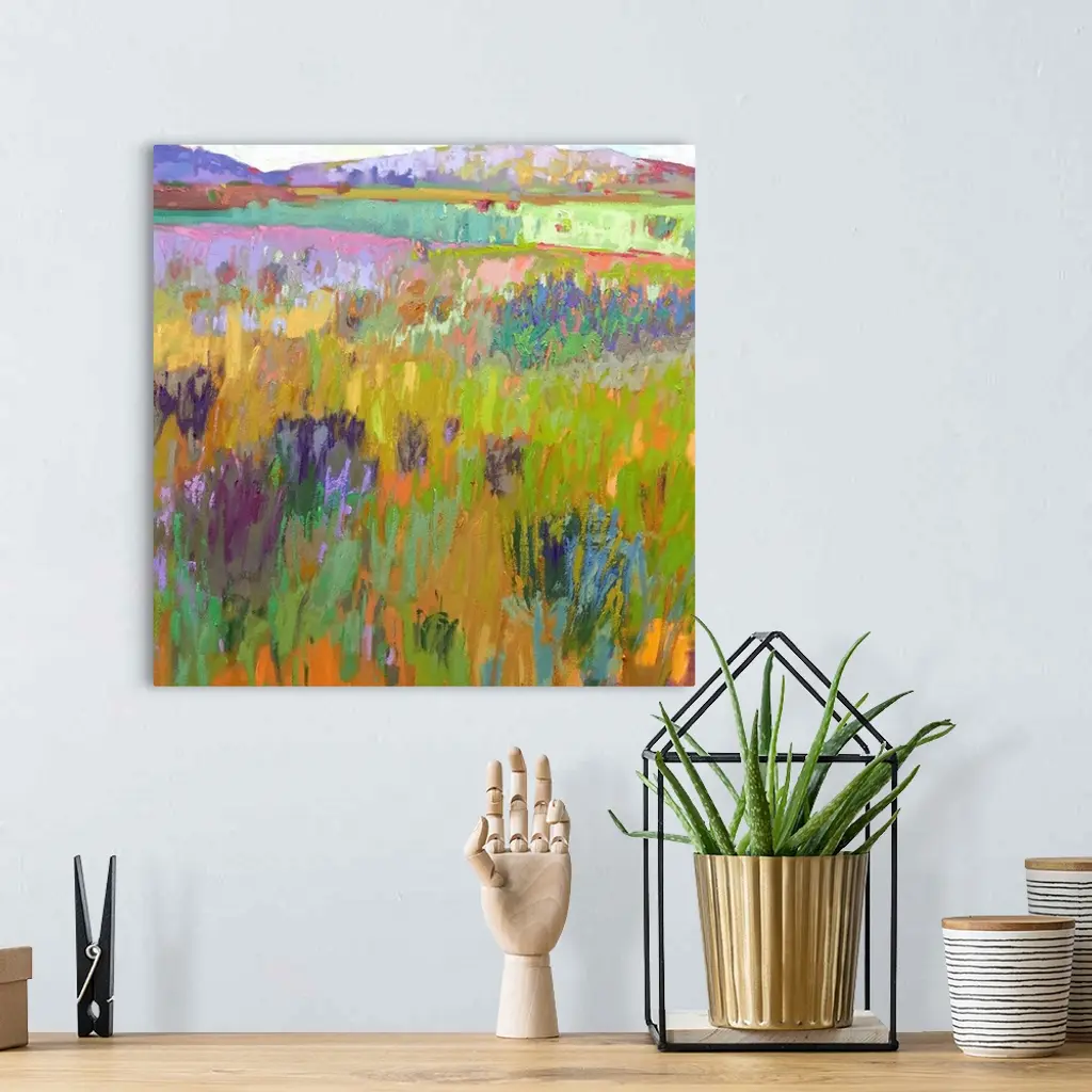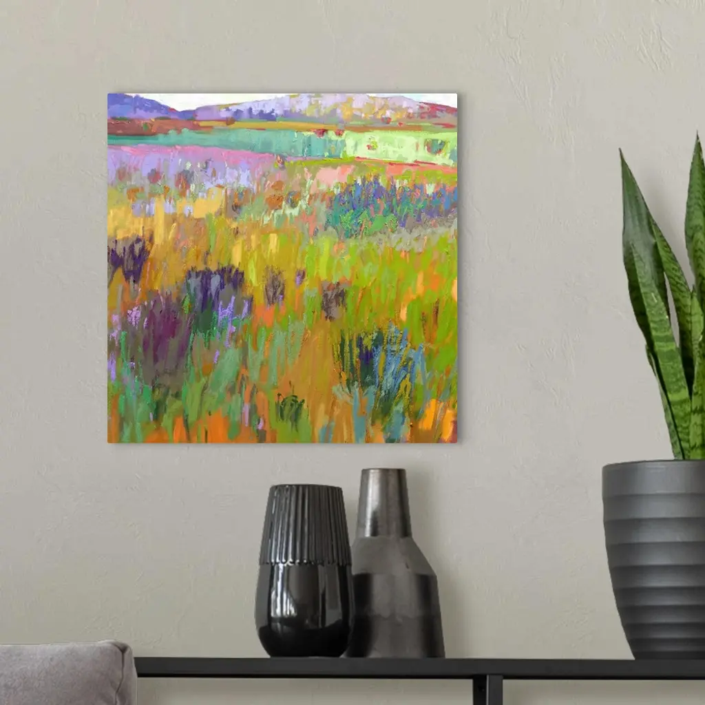 A square abstract of a field with flowers painted with brush strokes of vibrant colors.