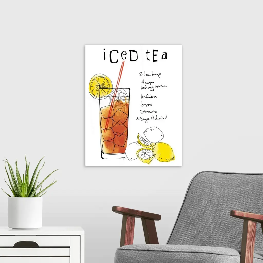 This vertical decorative art for a kitchen or cafo gives hand written instructions for making ice tea (sugar if desired) and a line drawing of tall glass garnished with a lemon and straw.