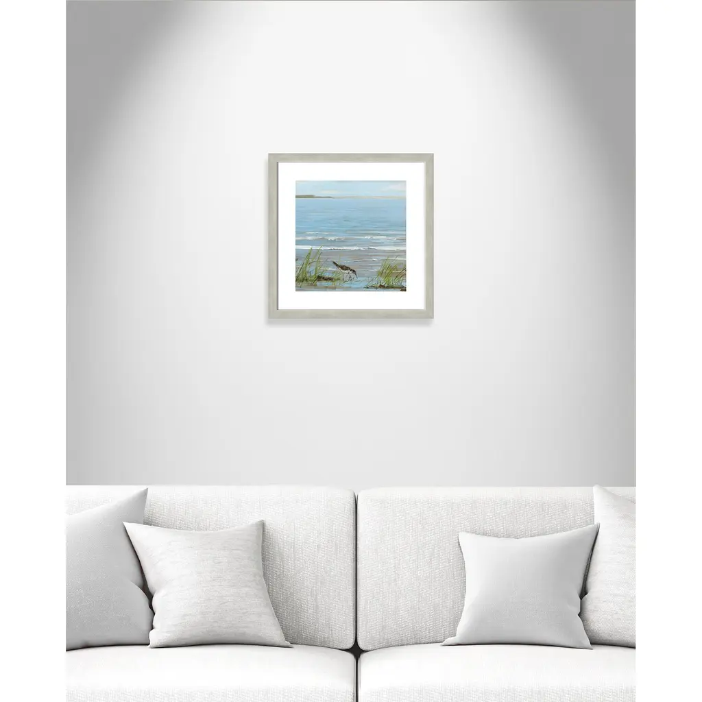 This soothing, tranquil seaside image of a bird strolling along the coastline, 'Afternoon on the Shore II', will bring the beauty of the sea to your living room. Finished in a modern frame made of PS materials, this is the perfect addition to your walls. Archival fine art giclée print on acid-free and lignin-free 100% cotton rag paper; image includes a bright white self-matting border Printed with gallery-quality inks using the finest giclée print technology for unsurpassed color gamut and clarity Lightweight and finished under shatter-resistant acrylic; hanging hardware attached for easy and secure installation Handcrafted in the USA and ships with a Certificate of Authenticity Lightweight and finished under shatter-resistant acrylic