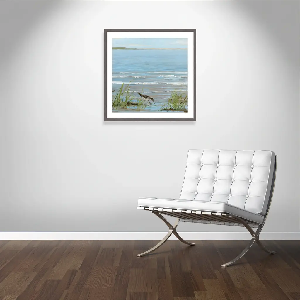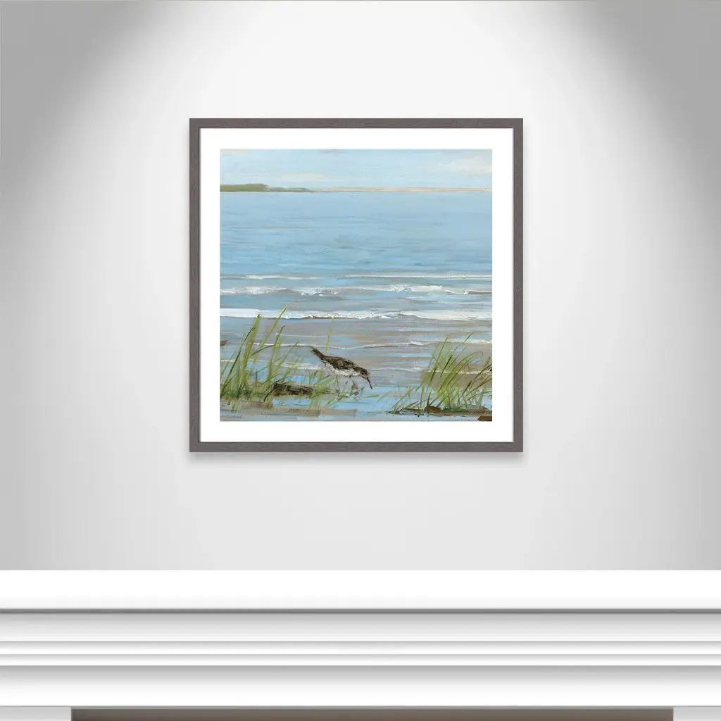 This soothing, tranquil seaside image of a bird strolling along the coastline, 'Afternoon on the Shore II', will bring the beauty of the sea to your living room. Finished in a modern frame made of PS materials, this is the perfect addition to your walls. Archival fine art giclée print on acid-free and lignin-free 100% cotton rag paper; image includes a bright white self-matting border Printed with gallery-quality inks using the finest giclée print technology for unsurpassed color gamut and clarity Lightweight and finished under shatter-resistant acrylic; hanging hardware attached for easy and secure installation Handcrafted in the USA and ships with a Certificate of Authenticity Lightweight and finished under shatter-resistant acrylic