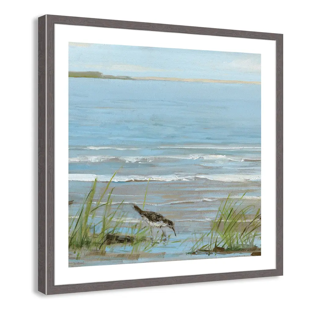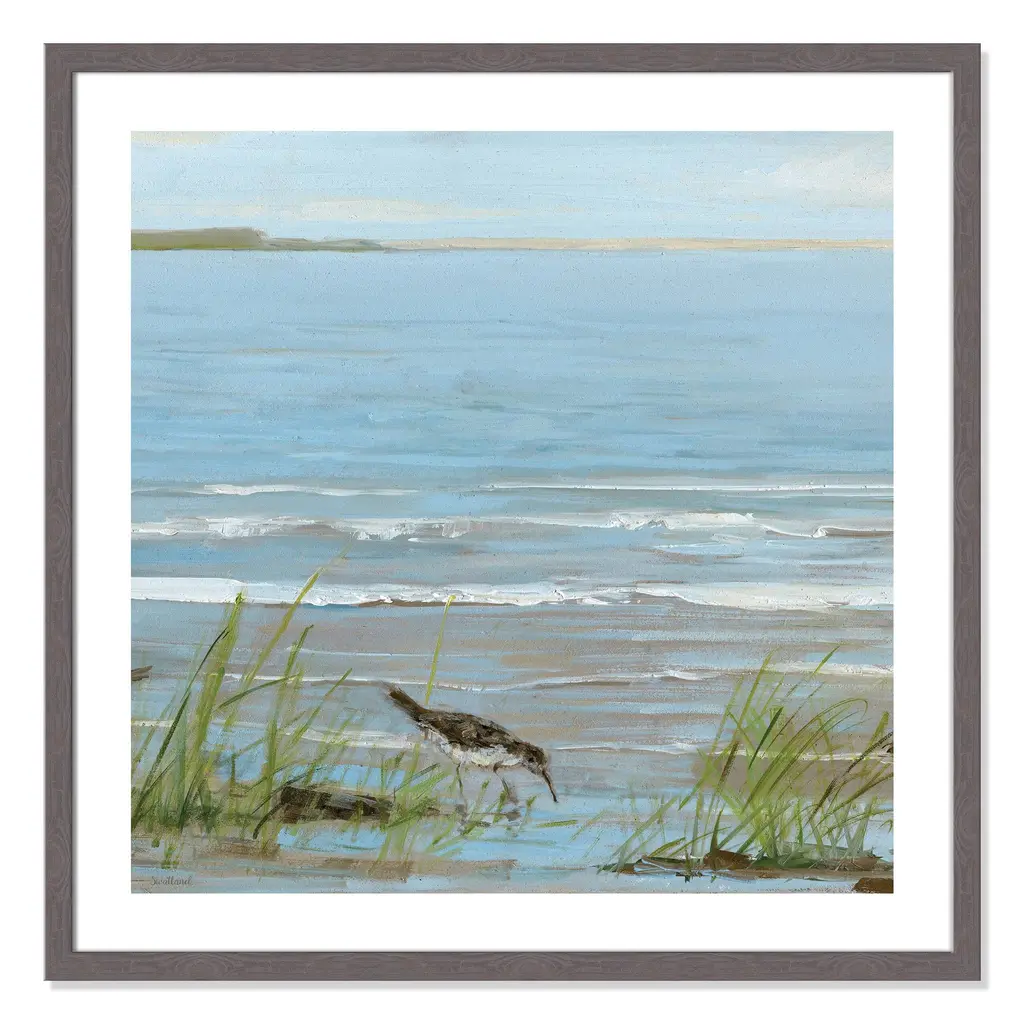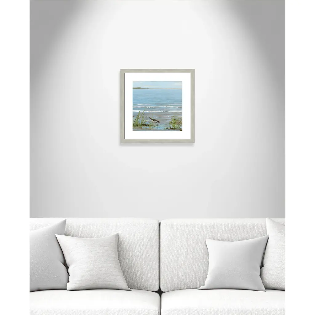 This soothing, tranquil seaside image of a bird strolling along the coastline, 'Afternoon on the Shore II', will bring the beauty of the sea to your living room. Finished in a modern frame made of PS materials, this is the perfect addition to your walls. Archival fine art giclée print on acid-free and lignin-free 100% cotton rag paper; image includes a bright white self-matting border Printed with gallery-quality inks using the finest giclée print technology for unsurpassed color gamut and clarity Lightweight and finished under shatter-resistant acrylic; hanging hardware attached for easy and secure installation Handcrafted in the USA and ships with a Certificate of Authenticity Lightweight and finished under shatter-resistant acrylic