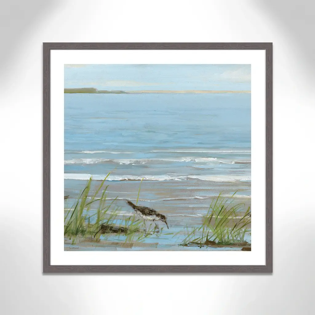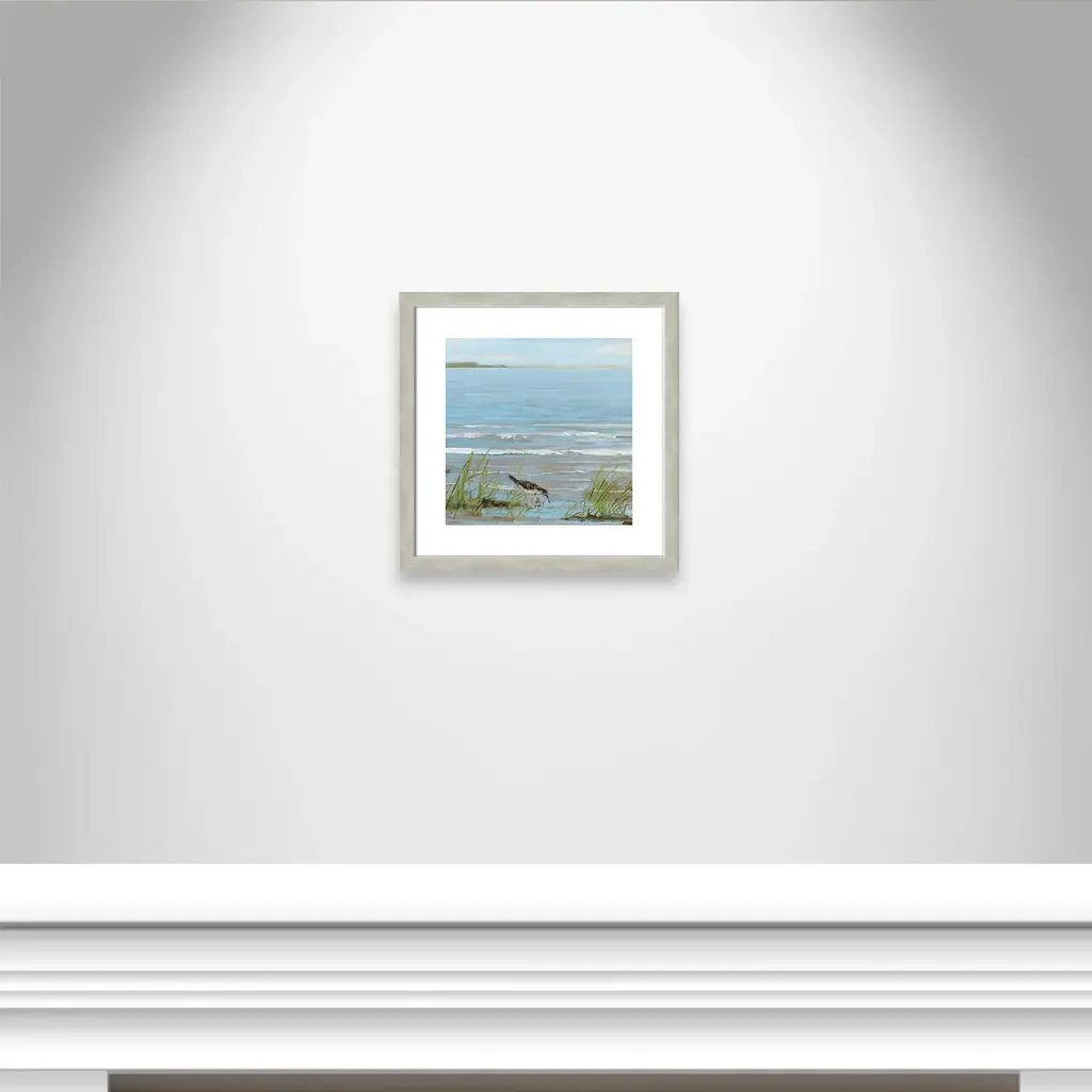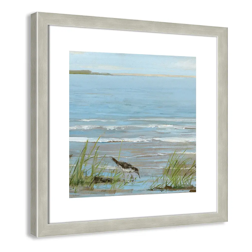 This soothing, tranquil seaside image of a bird strolling along the coastline, 'Afternoon on the Shore II', will bring the beauty of the sea to your living room. Finished in a modern frame made of PS materials, this is the perfect addition to your walls. Archival fine art giclée print on acid-free and lignin-free 100% cotton rag paper; image includes a bright white self-matting border Printed with gallery-quality inks using the finest giclée print technology for unsurpassed color gamut and clarity Lightweight and finished under shatter-resistant acrylic; hanging hardware attached for easy and secure installation Handcrafted in the USA and ships with a Certificate of Authenticity Lightweight and finished under shatter-resistant acrylic