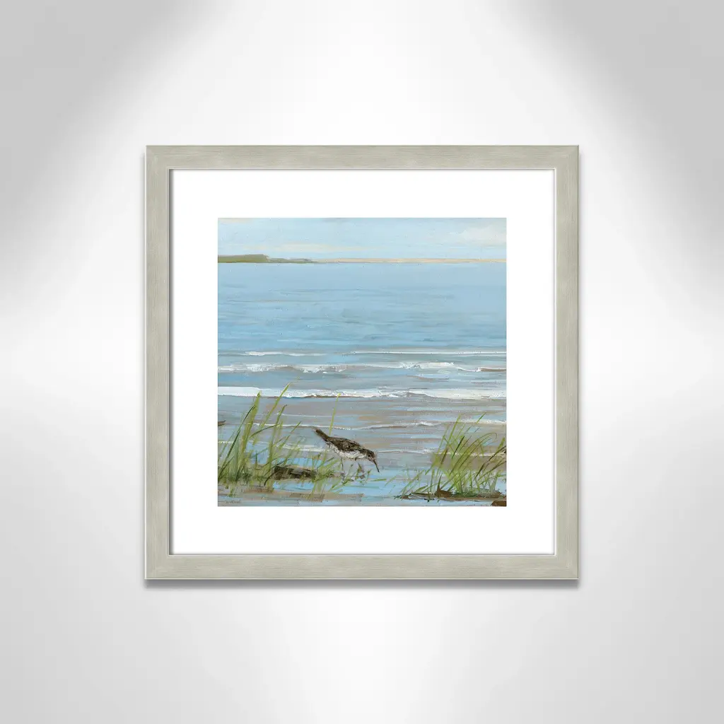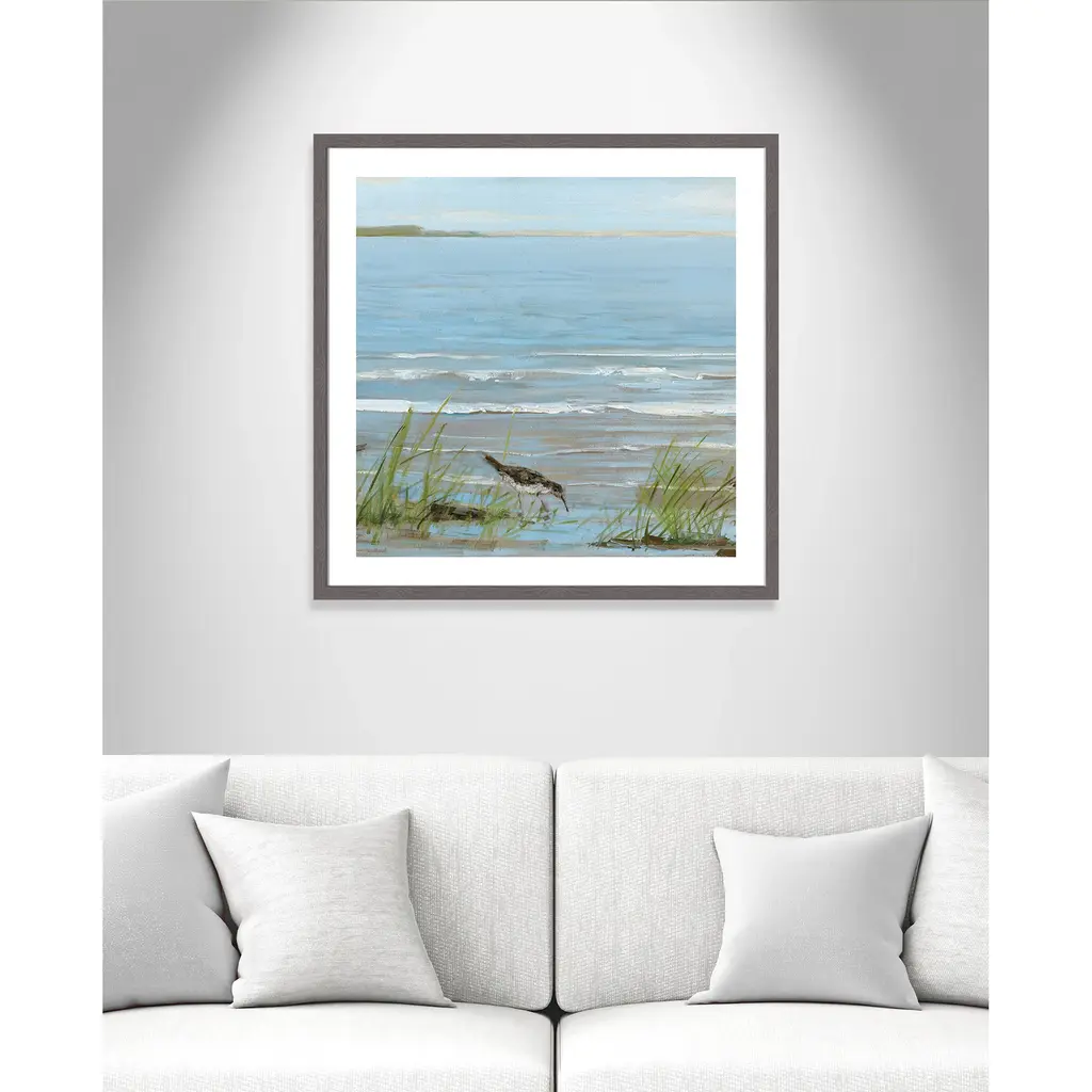 This soothing, tranquil seaside image of a bird strolling along the coastline, 'Afternoon on the Shore II', will bring the beauty of the sea to your living room. Finished in a modern frame made of PS materials, this is the perfect addition to your walls. Archival fine art giclée print on acid-free and lignin-free 100% cotton rag paper; image includes a bright white self-matting border Printed with gallery-quality inks using the finest giclée print technology for unsurpassed color gamut and clarity Lightweight and finished under shatter-resistant acrylic; hanging hardware attached for easy and secure installation Handcrafted in the USA and ships with a Certificate of Authenticity Lightweight and finished under shatter-resistant acrylic
