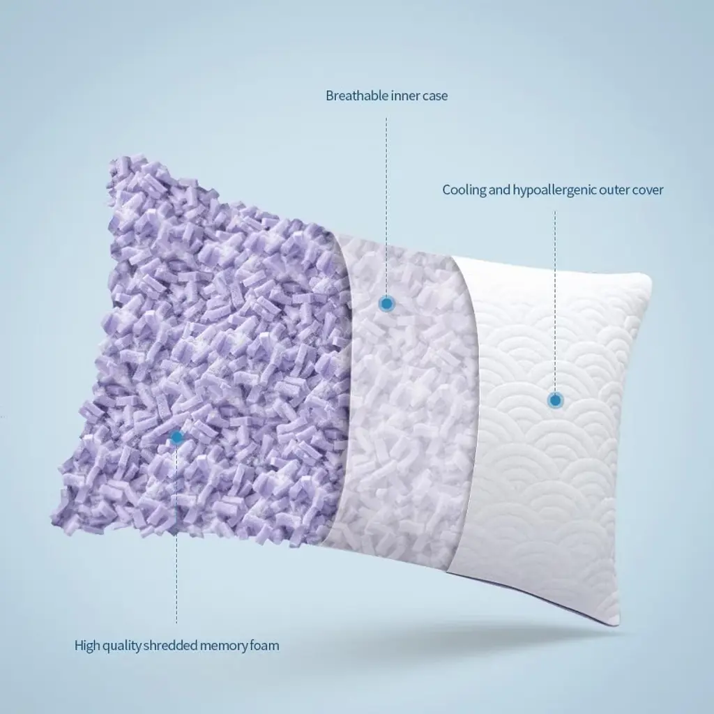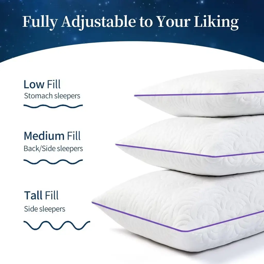 FILLER MATERIAL: The filler material Made from Premium infused Gel particles and calming lavender Memory Foam and Microfiber blend, infused calming lavender to helps draw out heat and keep you at a comfortable temperature throughout the night LUXURIOUS PILLOWCASE:One Side Of The Pillowcase is Comfortable Surface.And The Other Side Is Cool-fabric Surface(It is Made of Proprietary Ice Silky Fabric that Feels Cool to the touch).The Breathable Cover Keeps Your Pillows Dry and Provide Comfort FULLY ADJUSTABLE_Our unique adjustable design allows you to access the memory foam fill, which you can add or remove to suit your size, shape or sleep position. Sleep comfortably and aligned at last. It is ideal for sleeping on the side, abdomen and back GOOD PILLOW FOR YOU: Unlike solid memory foam pillow, the crushed up memory foam pillows can be foldable and bring adjustable loft for different sleepers. More than that, these adjustable loft pillows are more supportive and firmer than down pillows