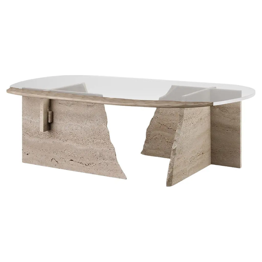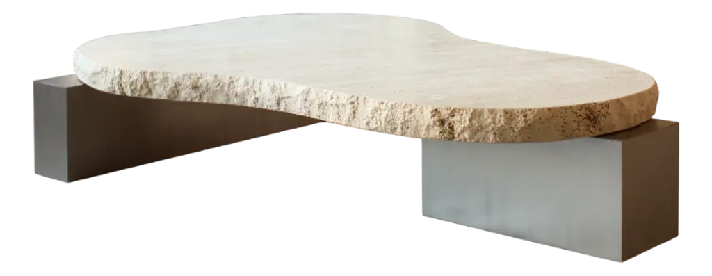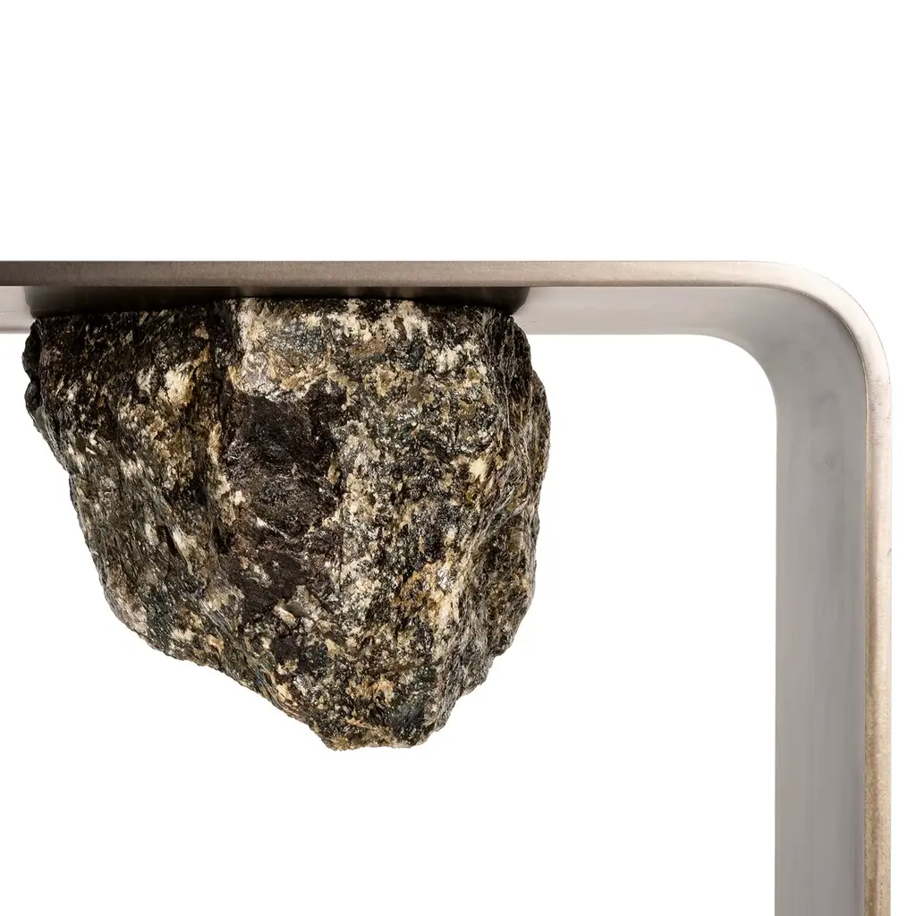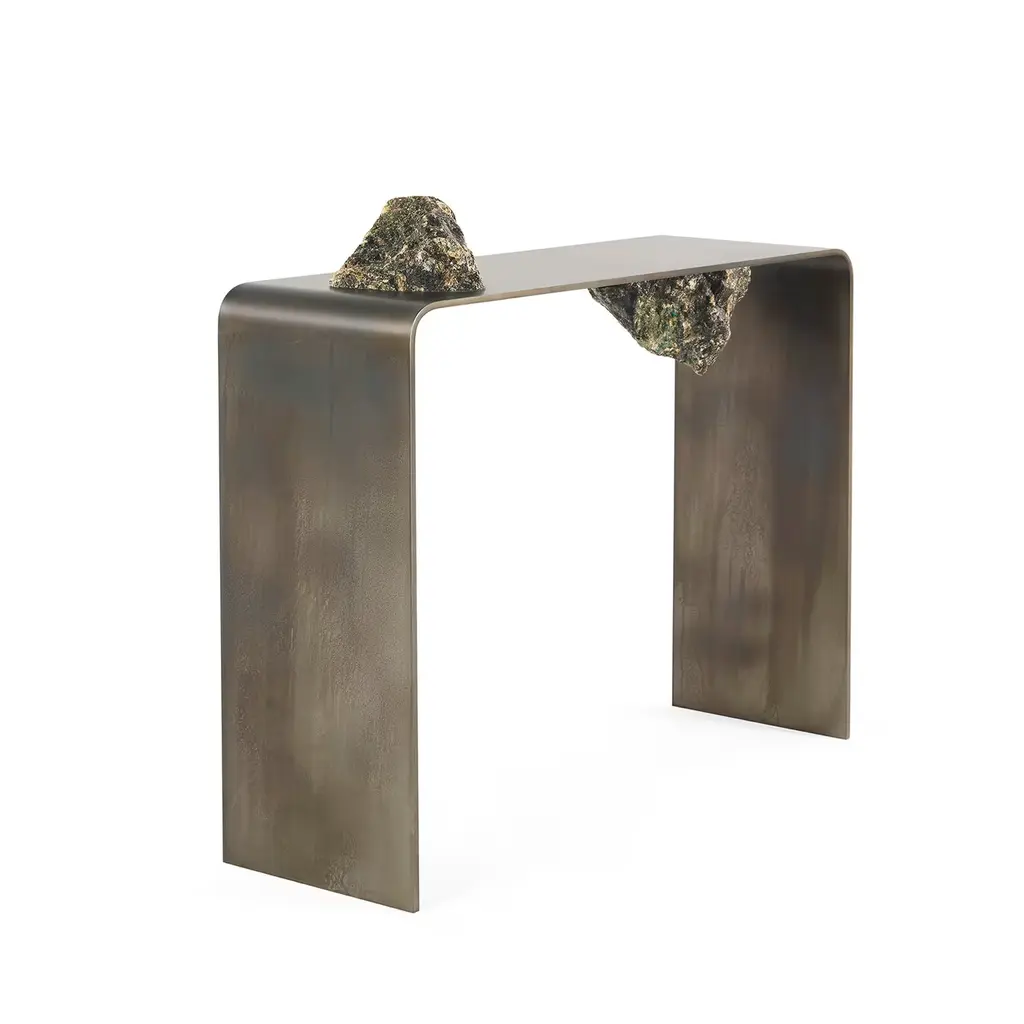 "A fragment from distant planets segmented in two parts intersects an archetypal plane conveying a cosmic sense of transformation. Stone and metal combined create functional sculptures, unique in their essence, simulating otherworldly landscapes." Console made of calendered metal structure in bronze finishing with manganese salt treatment. Natural raw Labradorite elements fixed to the structure. Variation Details: Console made of calendered metal structure in bronze finishing with manganese salt treatment. Natural stone elements fixed to the structure to choose from Obsidian, raw Labradorite, raw Amethyst, Lapis Lazuli.