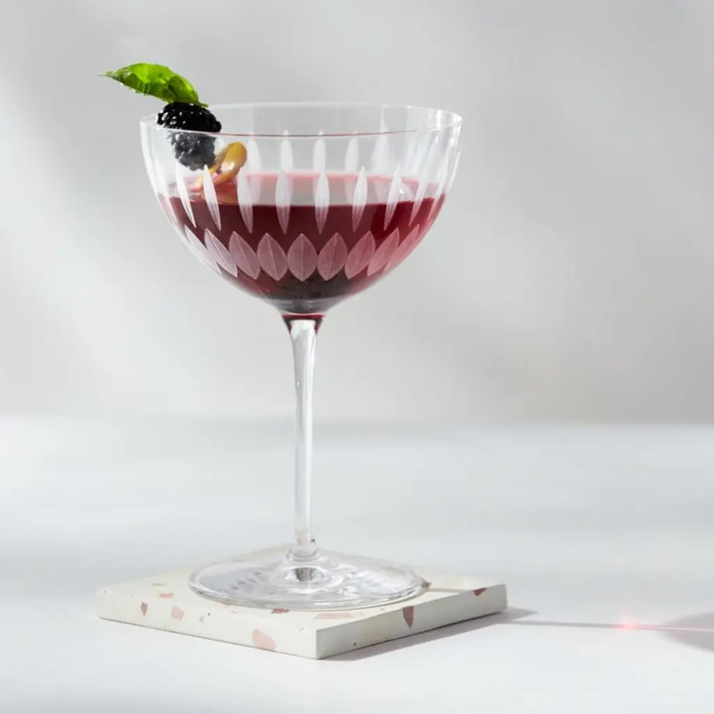 The classic coupe is having a comeback in our Agnes cocktail glass. Accented with delicate etchings, the vintage-style manhattan glass rounds out a broad saucer-shaped bowl for sipping champagne cocktails, herbal Bee's Knees and retro Brandy Alexanders. The iconic glass of the craft cocktail movement keeps drinks cold thanks to its long stem while its shallow bowl prevents spills. Crafted of brilliant crystalline glass, the Agnes coupe cleans up easily in the dishwasher after cocktail hour.