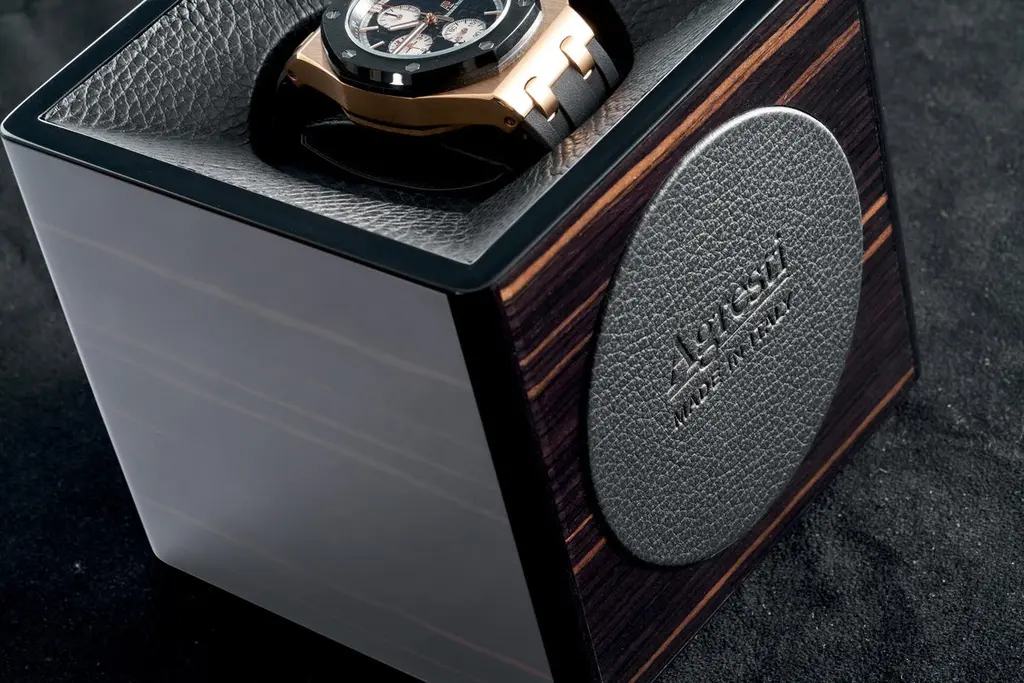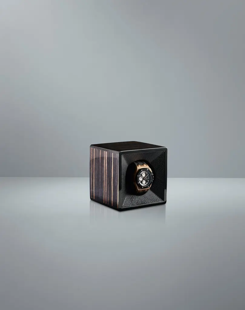 Watch winder for automatic watch. Leather lined. Winder made in Switzerland, battery operated. Available in polished red briar, polished ebony, or polished briar.