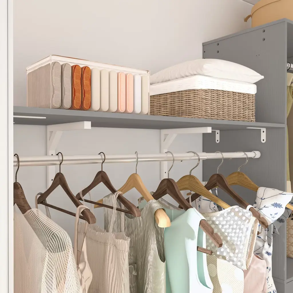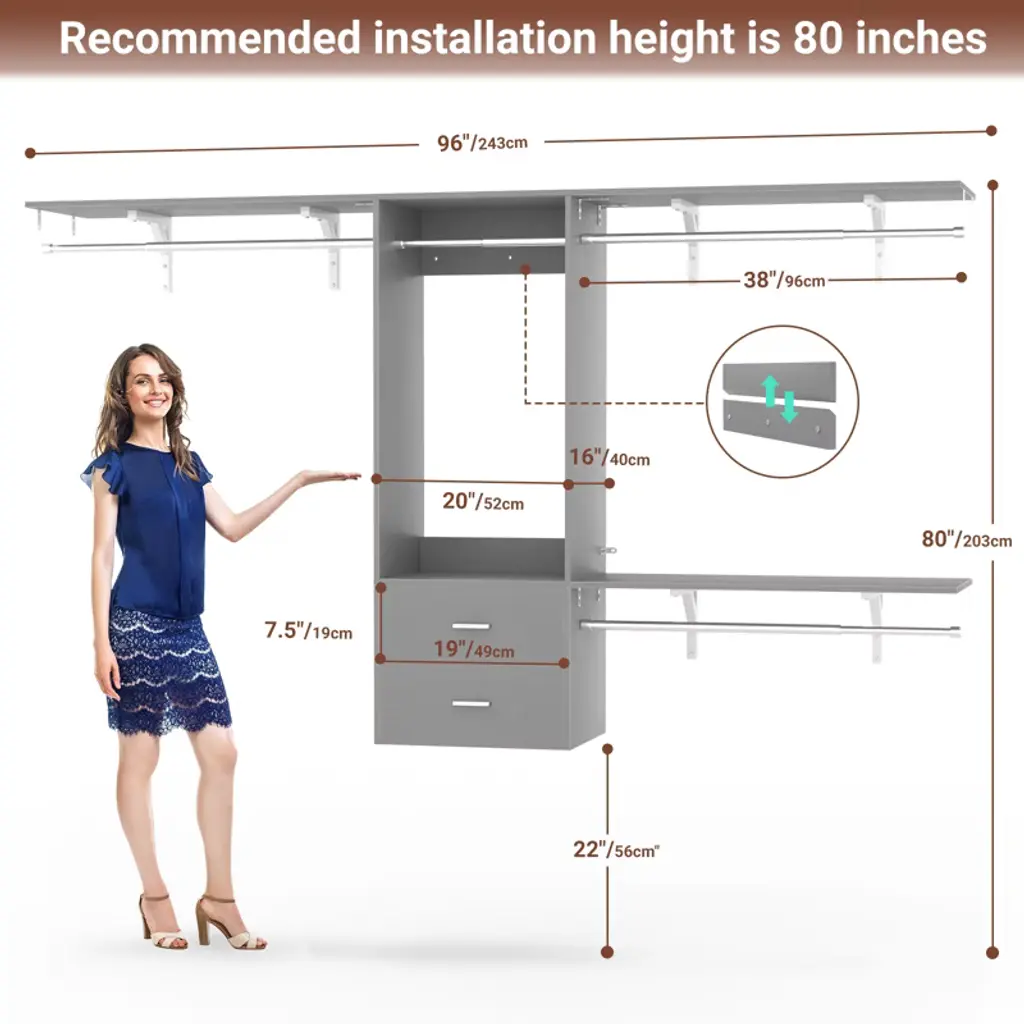 Tired of cramped closets and messy clothes piles? Our hanging wardrobe rack is the perfect solution for kids and adults alike! With a spacious bottom section for storage boxes, suitcases, or long garments, and adjustable height to grow with your child, this rack offers years of versatile use. Customize your space with 2 large drawers, 1 open shelf, 3 top shelving towers, and 3 hanging rods, including 3 adjustable shelves and width-adjustable shelves to fit your needs. Mount it securely to the wall with included hardware to keep everything off the floor and safe from tipping. A fantastic gift for your children! Dimensions: 58"H × 16"L × 96"W.