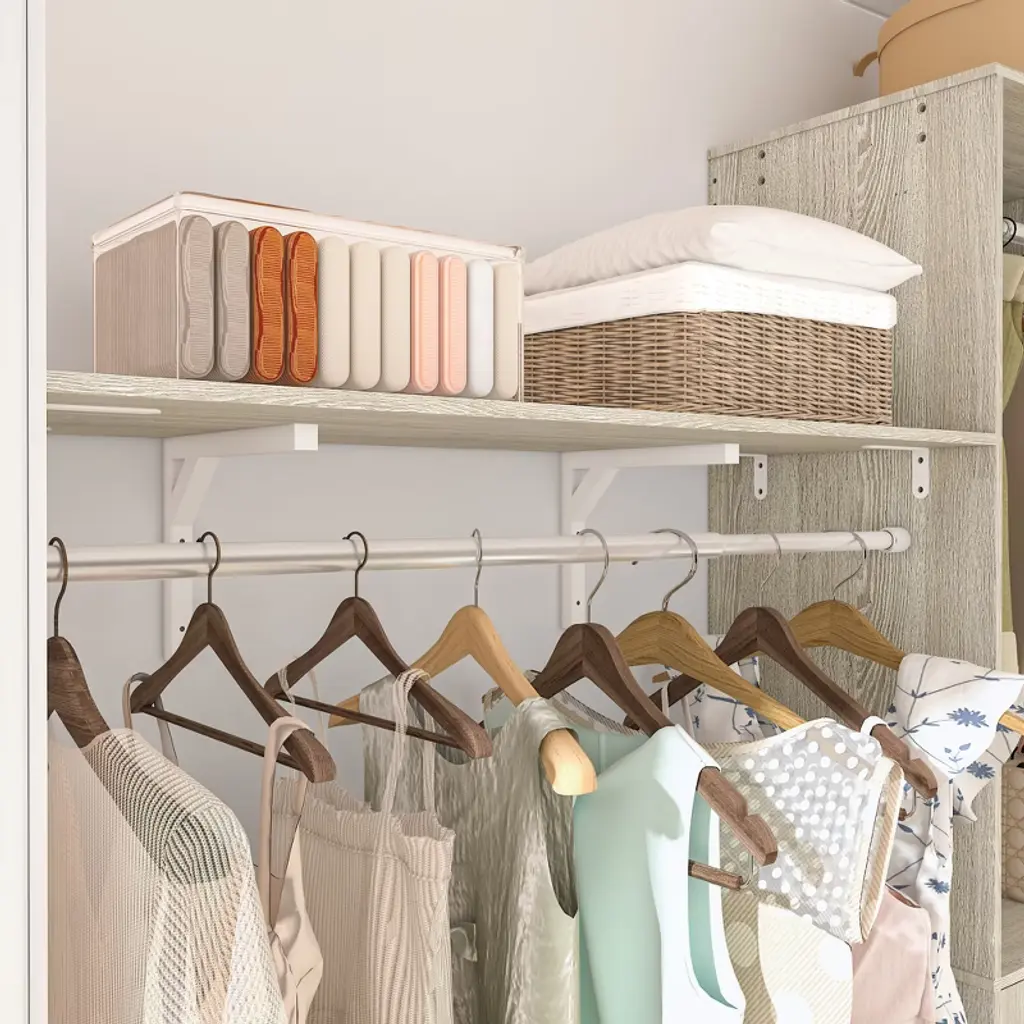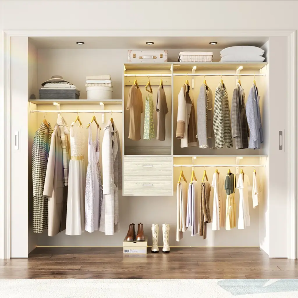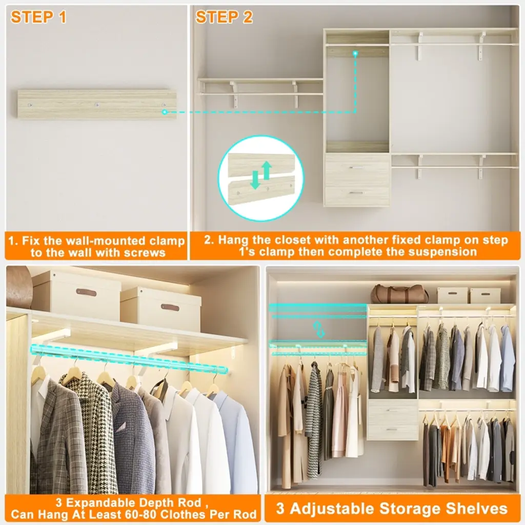Tired of cramped closets and messy clothes piles? Our hanging wardrobe rack is the perfect solution for kids and adults alike! With a spacious bottom section for storage boxes, suitcases, or long garments, and adjustable height to grow with your child, this rack offers years of versatile use. Customize your space with 2 large drawers, 1 open shelf, 3 top shelving towers, and 3 hanging rods, including 3 adjustable shelves and width-adjustable shelves to fit your needs. Mount it securely to the wall with included hardware to keep everything off the floor and safe from tipping. A fantastic gift for your children! Dimensions: 58"H × 16"L × 96"W.