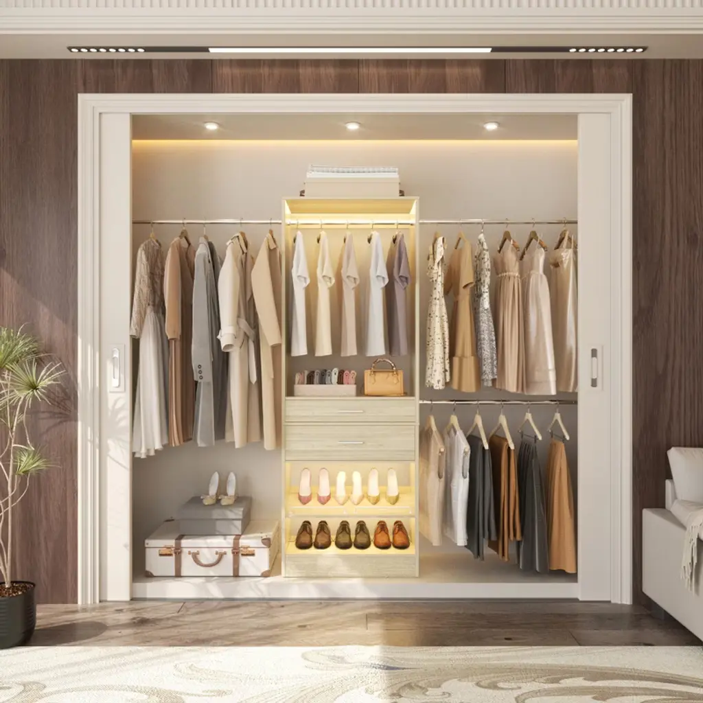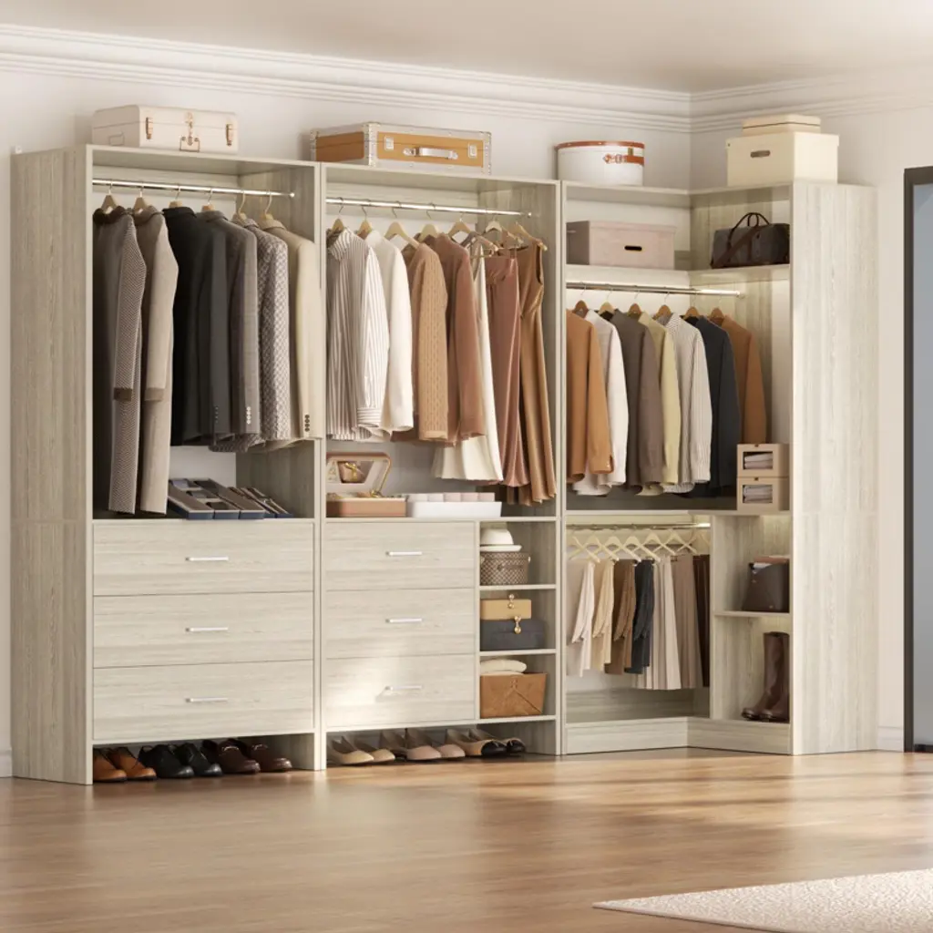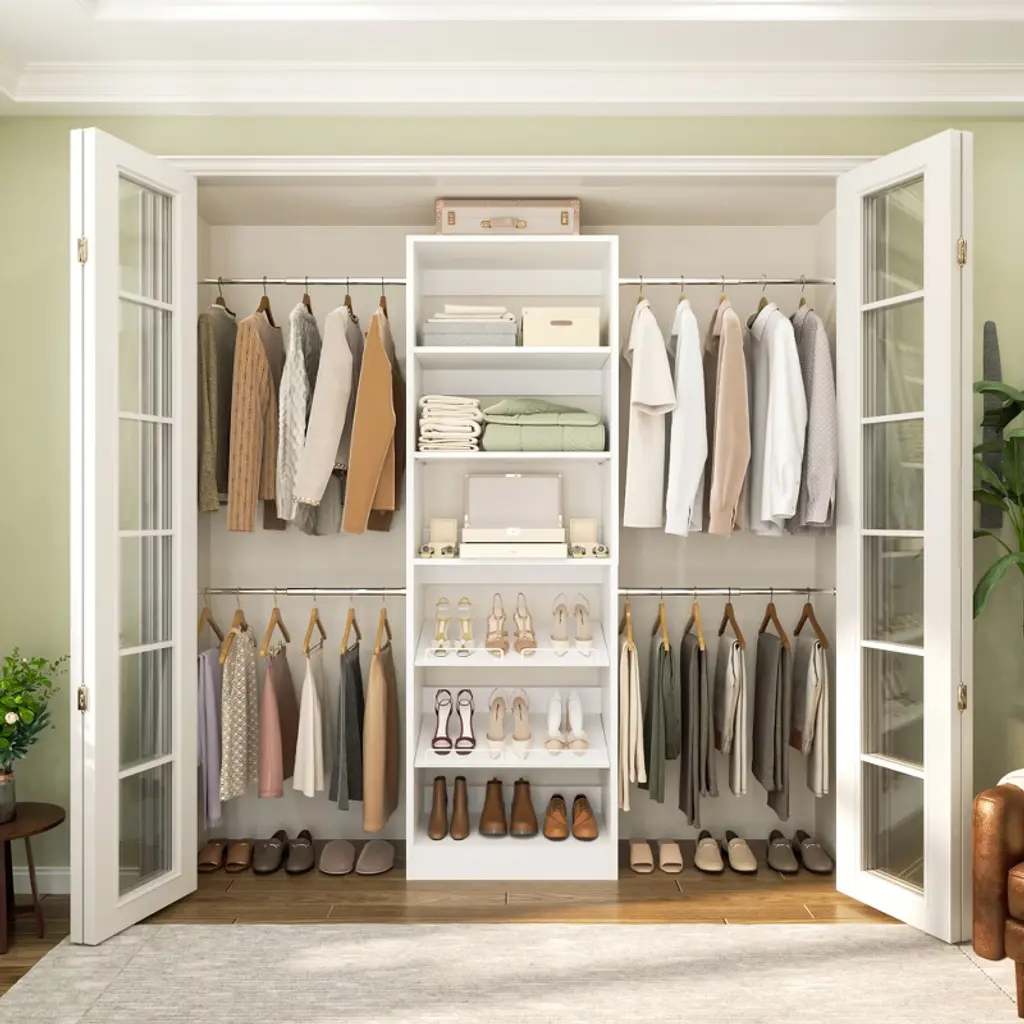 With the 96-inch closet system, you can easily design and install an attractive and practical closet system in your home. This DIY laminate system is suitable for closets ranging from 4 to 10 feet in width, providing up to 120 inches of shelf space and 144 inches of hanging space. The system combines hanging space, shoe storage, and drawers to meet all your needs and free up your hands.