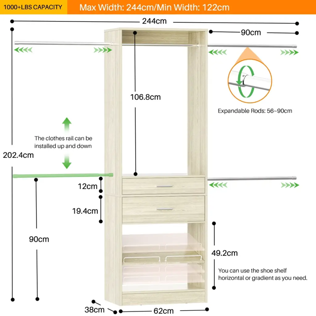 Aheaplus Closet System With 2 Wooden Drawers And Adjustable Shoes Rack