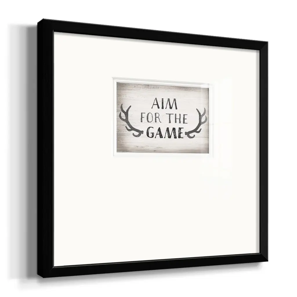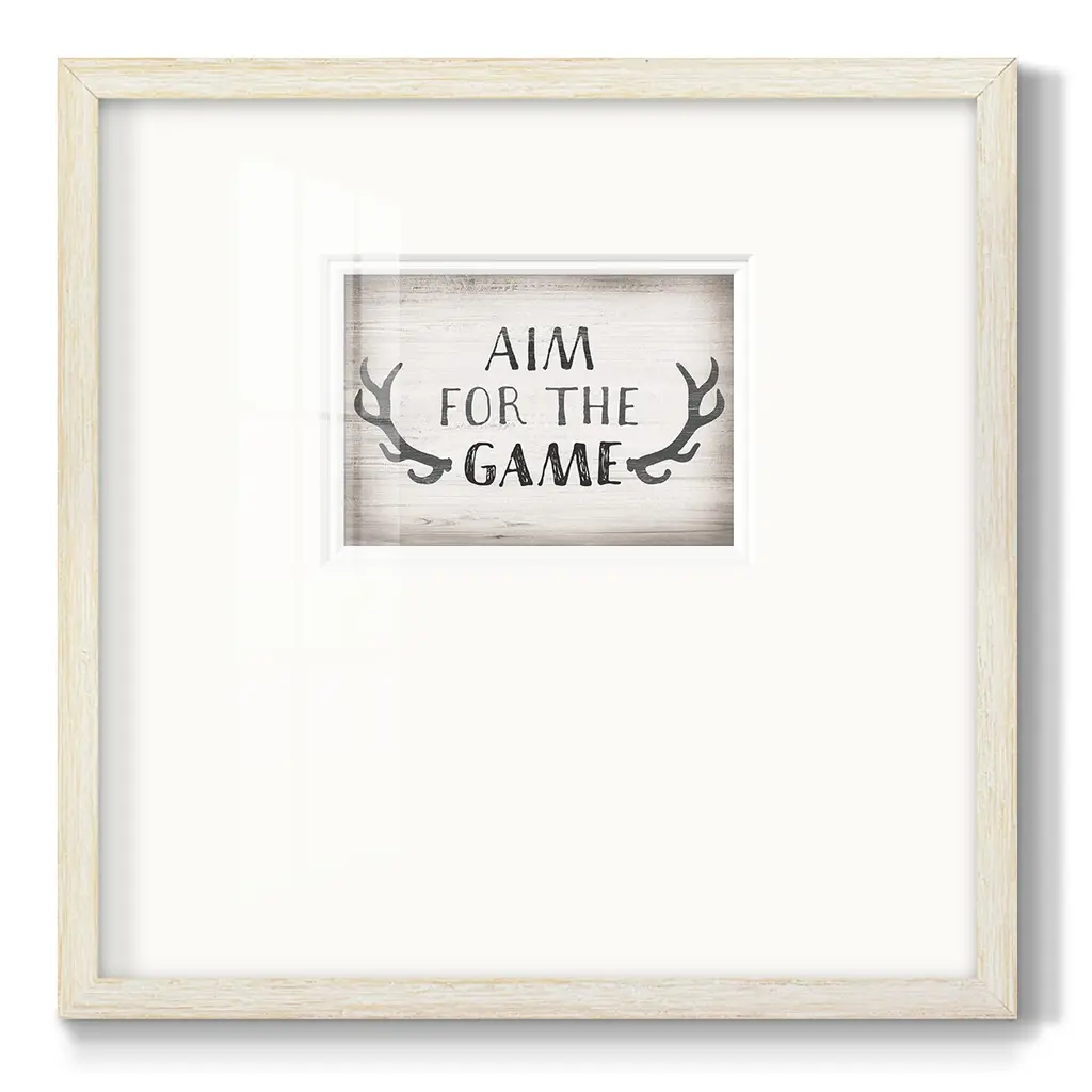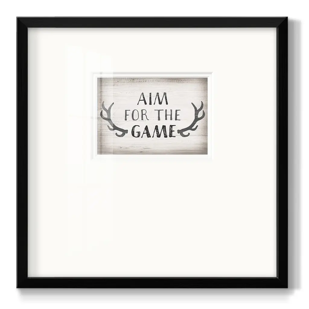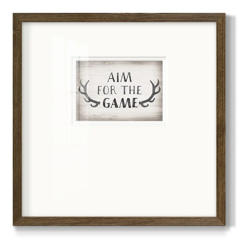 Aim GamePremium Framed Print A framed cold pressed paper print featuring superior double matting and quality frame. 2 SIZES AVAILABLE 16''X16''' - Overall Size 20''X20''' - Overall Size Each piece is made to order. Each piece comes with hanging hardware. Made in the USA Ready to Hang Giclee Paper Print Plexiglass Beveled Matt Board Double Matte Board