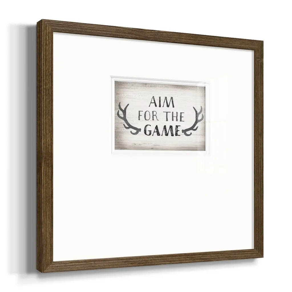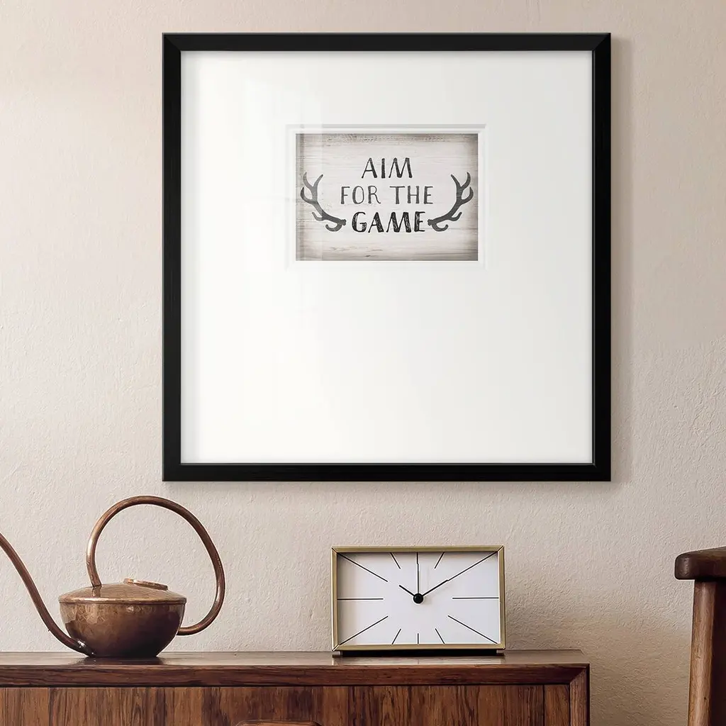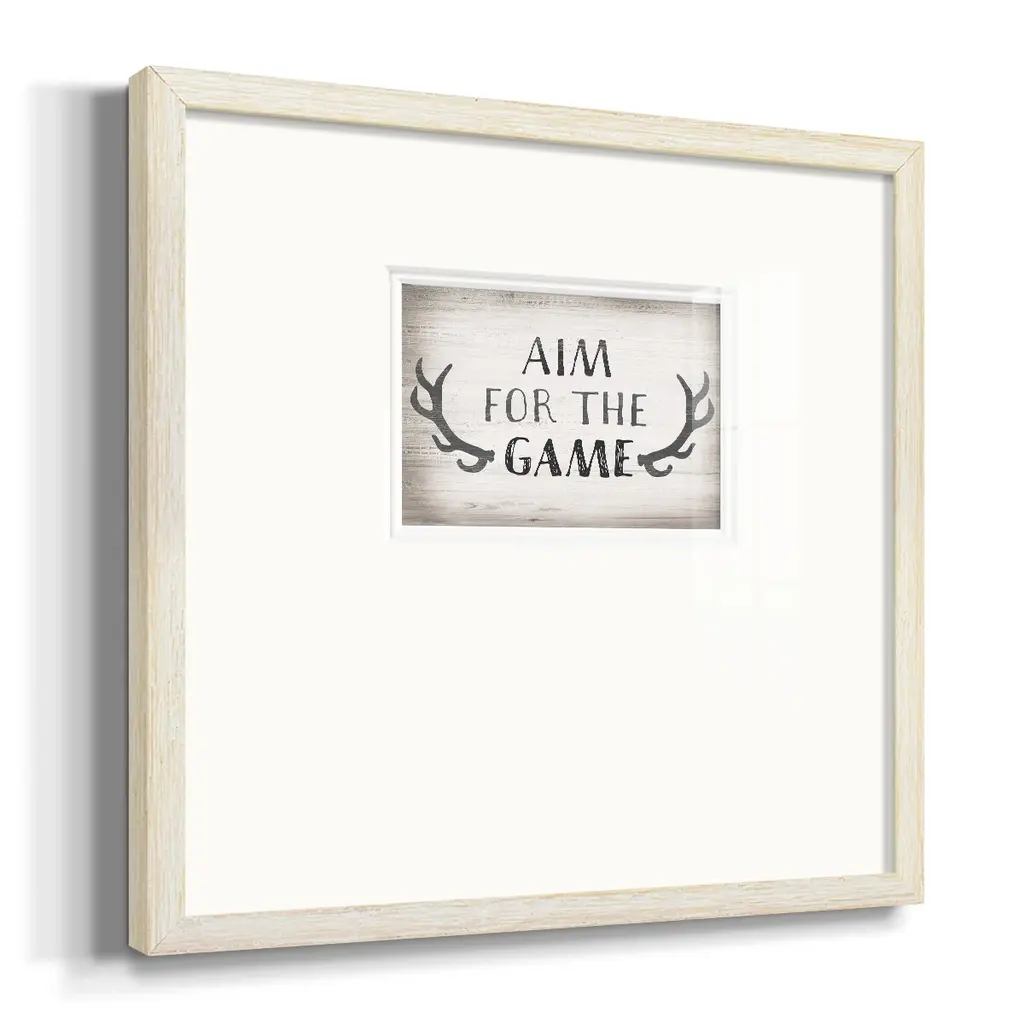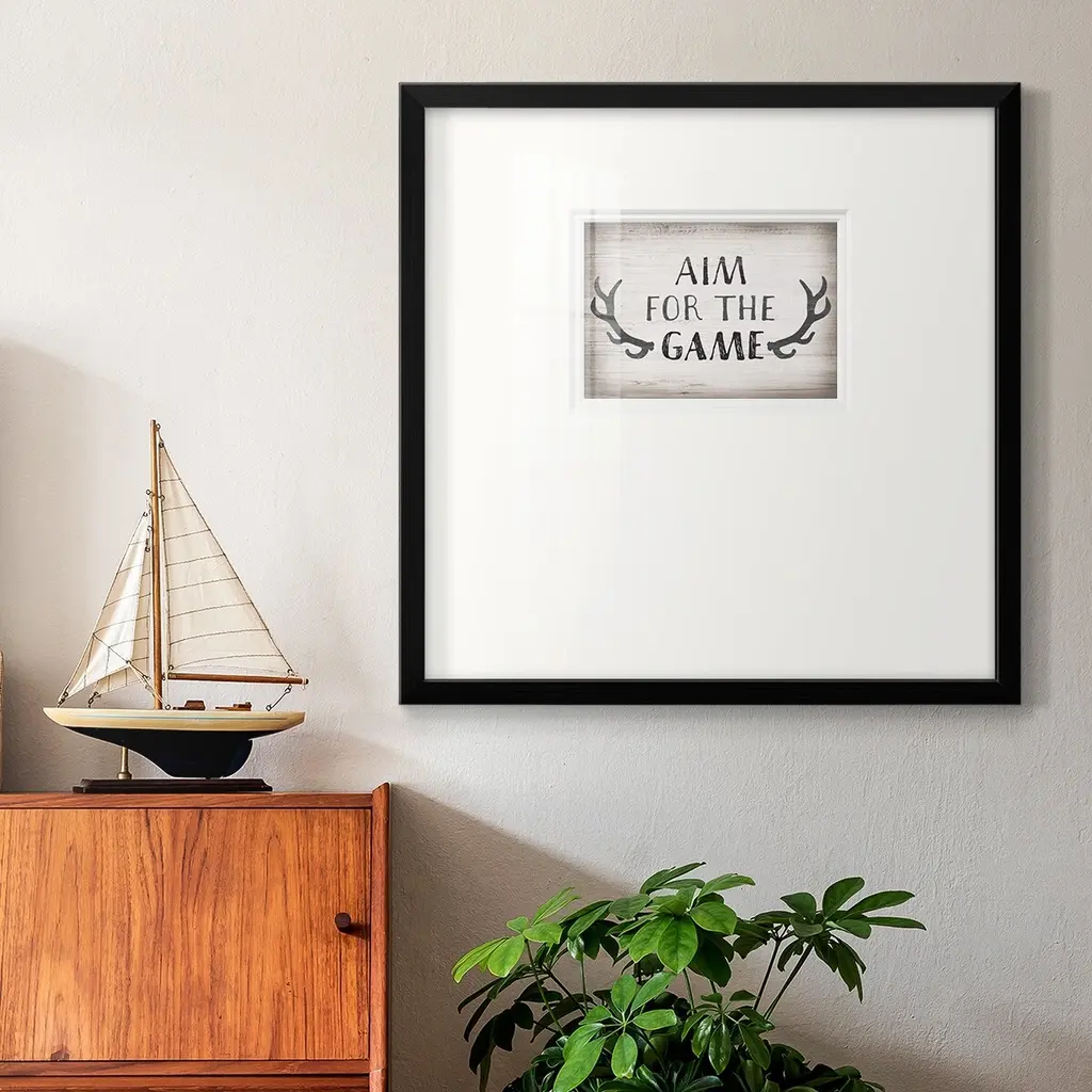 Aim GamePremium Framed Print A framed cold pressed paper print featuring superior double matting and quality frame. 2 SIZES AVAILABLE 16''X16''' - Overall Size 20''X20''' - Overall Size Each piece is made to order. Each piece comes with hanging hardware. Made in the USA Ready to Hang Giclee Paper Print Plexiglass Beveled Matt Board Double Matte Board