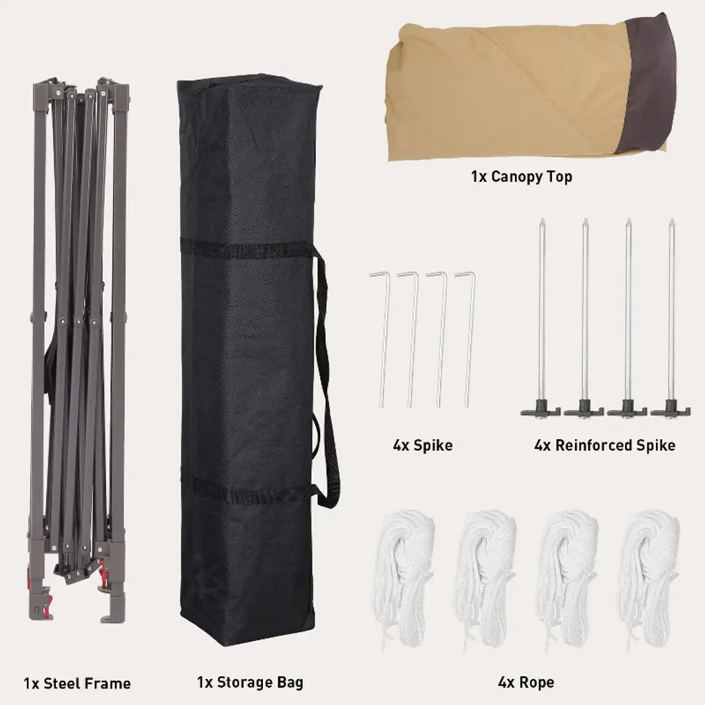 Specifications: Color: Coffee Frame Finish: Coffee Brown Frame Material: Metal Steel Weight: 37.48lbs Size: 129.92"D x 129.92"W x114.17"H Tent Cloth Material: 160g/m2 PA-coated polyester cloth Handbag Material: 300 x 600D PE Oxford cloth Package size:47"L×9"W×9"H N.W.: 36.376 lbs G.W.: 38.801lbs