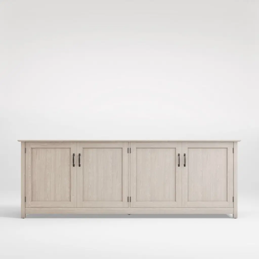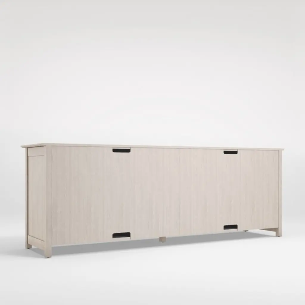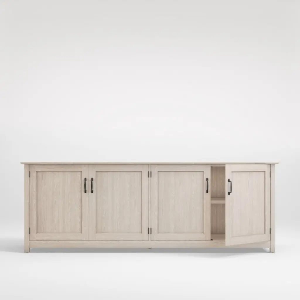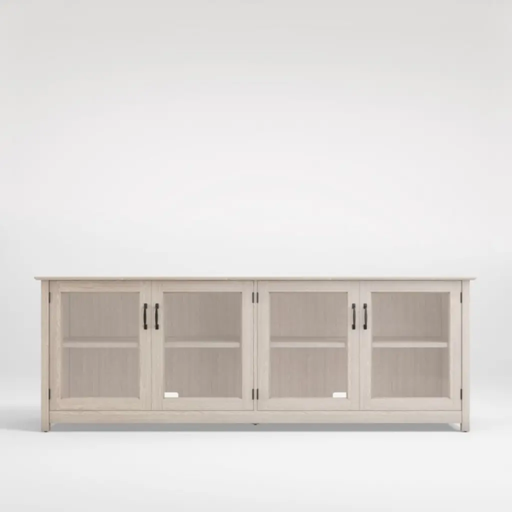 Measuring 85 inches long, this generously sized media console takes a versatile approach to storage with interchangeable door panels in glass or solid wood. It has a clean design that shows off the beauty of white oak with a pickled finish.