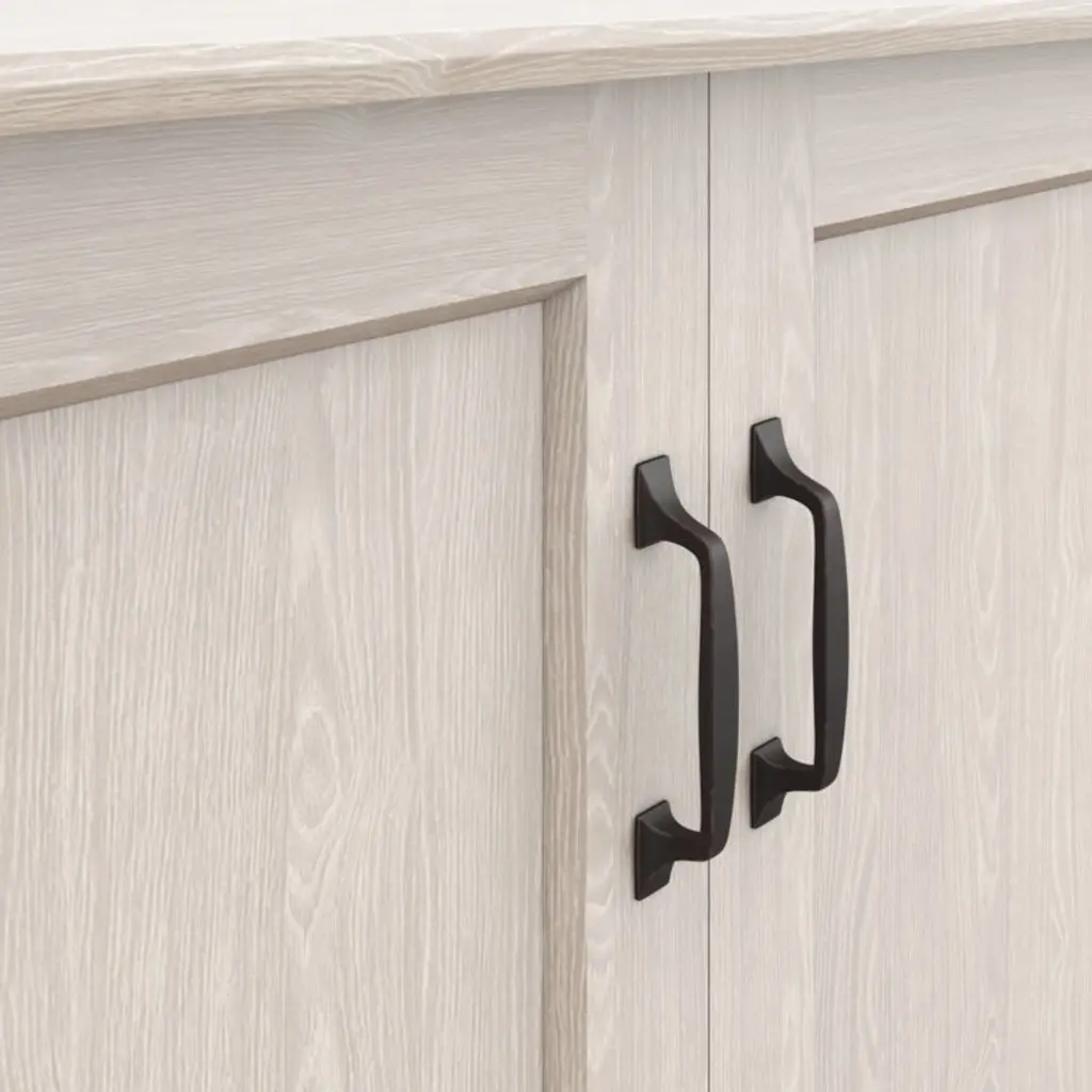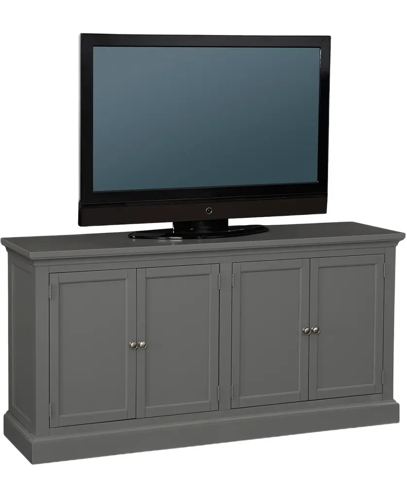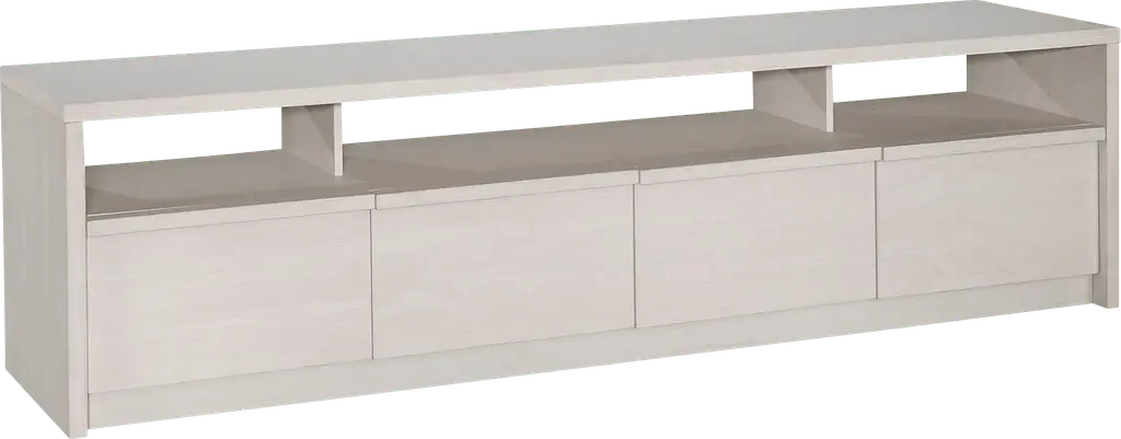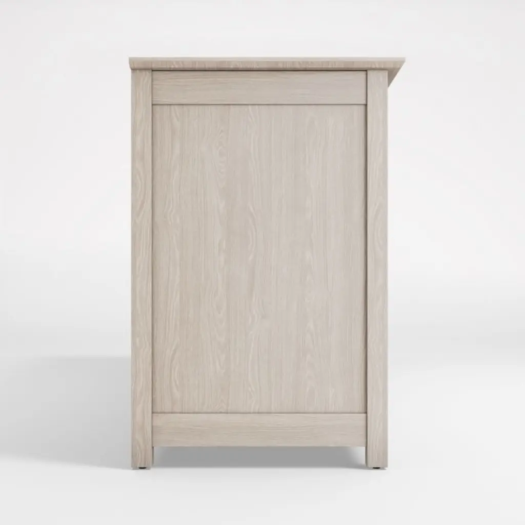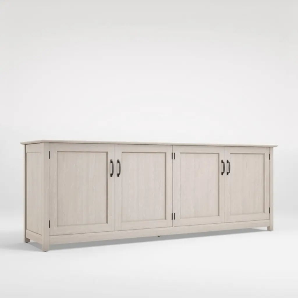 Measuring 85 inches long, this generously sized media console takes a versatile approach to storage with interchangeable door panels in glass or solid wood. It has a clean design that shows off the beauty of white oak with a pickled finish.