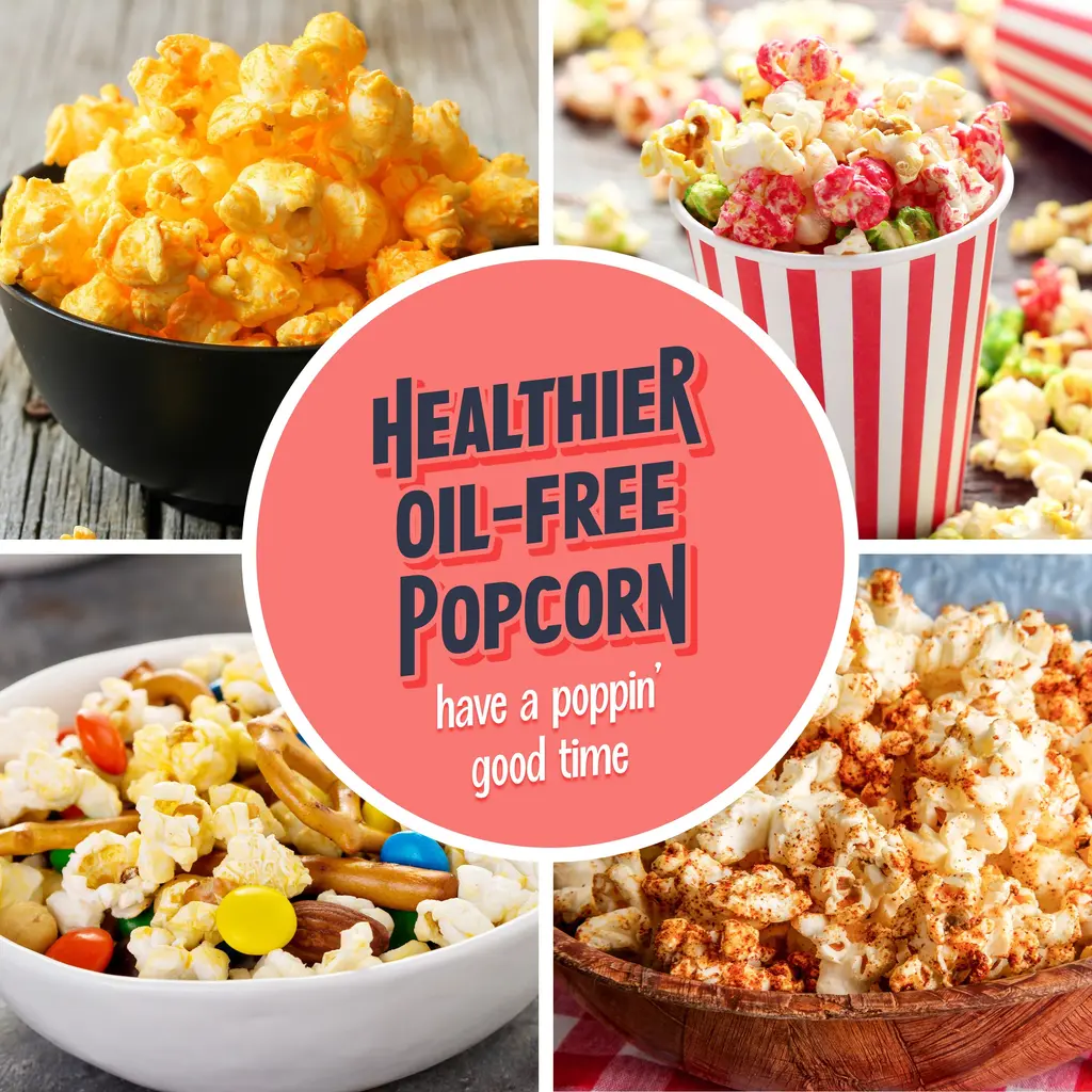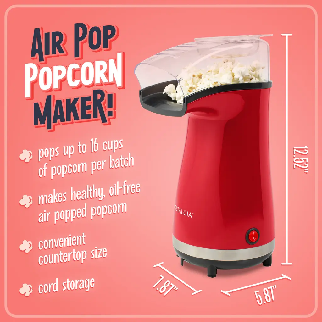 With just a push of a button, this unit pops up to 8 cups of healthy, air-popped hot popcorn per batch, making it perfect for parties, large group gatherings, or family movie nights. The machine uses hot air instead of oil to quickly pop 12 cups of hot and fresh popcorn, providing a delicious low-fat and guilt-free treat. It includes a 3-ounce measuring cup to ensure the proper amount of kernels is used to avoid overfill. The unique popping chamber design creates swirling airflow, resulting in fewer un popped kernels, while the ergonomically designed popcorn chute guides the popped kernels into your bowl. Its compact design makes it perfect for countertops in apartments, dorms, and campers. Rubber feet provide extra stability during use, and the cord wrap nestled neatly into the base allows for tidy storage.