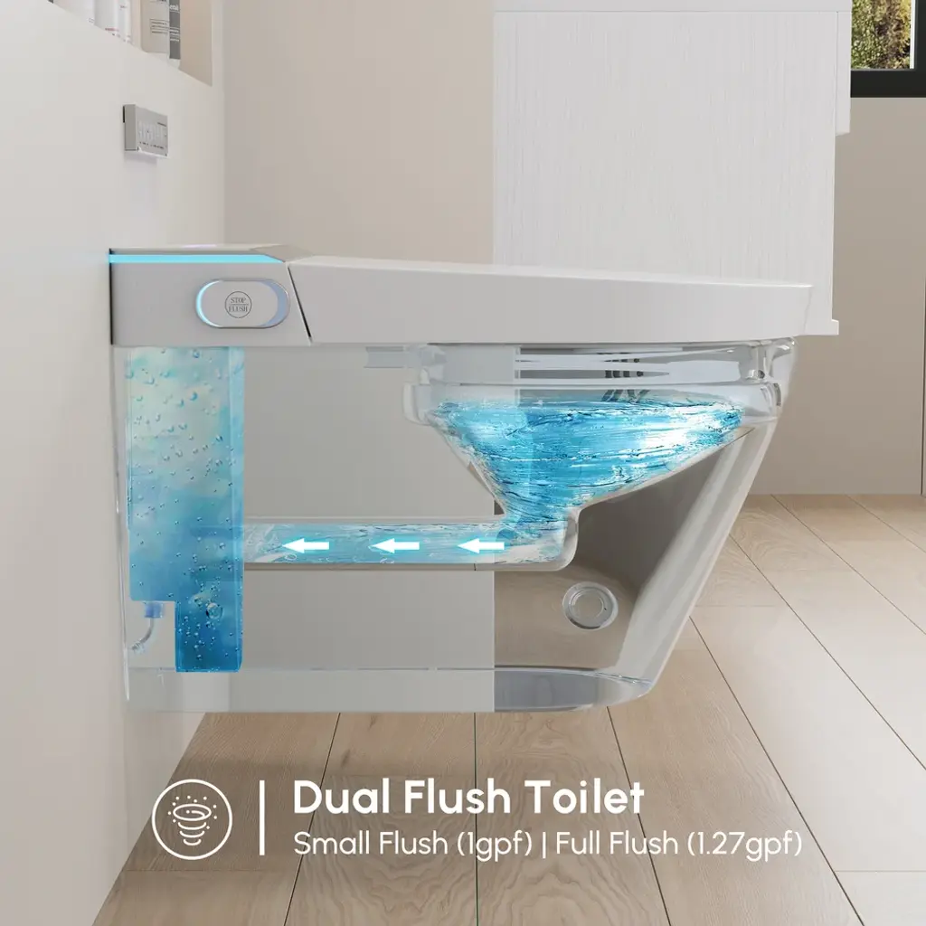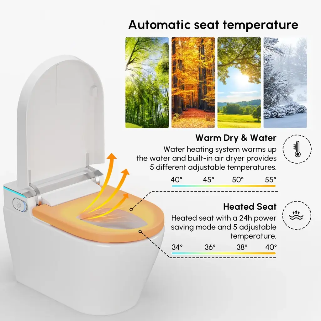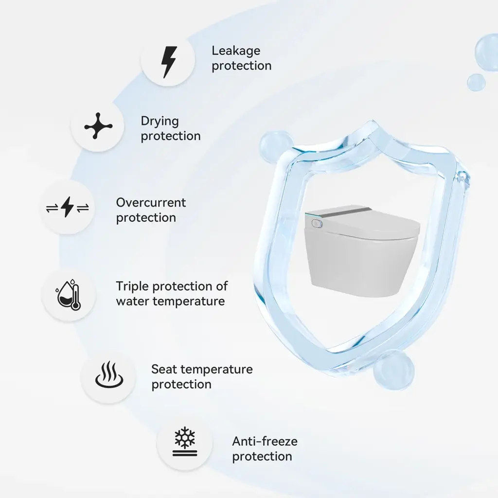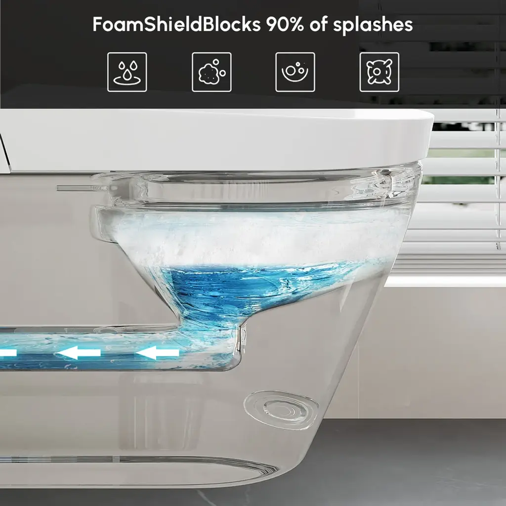 This wall-mounted Smart Toilet features innovative Foam Shield technology and auto-seasonal seat warming. With 4 water/4 air temp settings, self-cleaning nozzle, and built-in tank, it delivers premium hygiene without water pressure dependence. Remote control included.