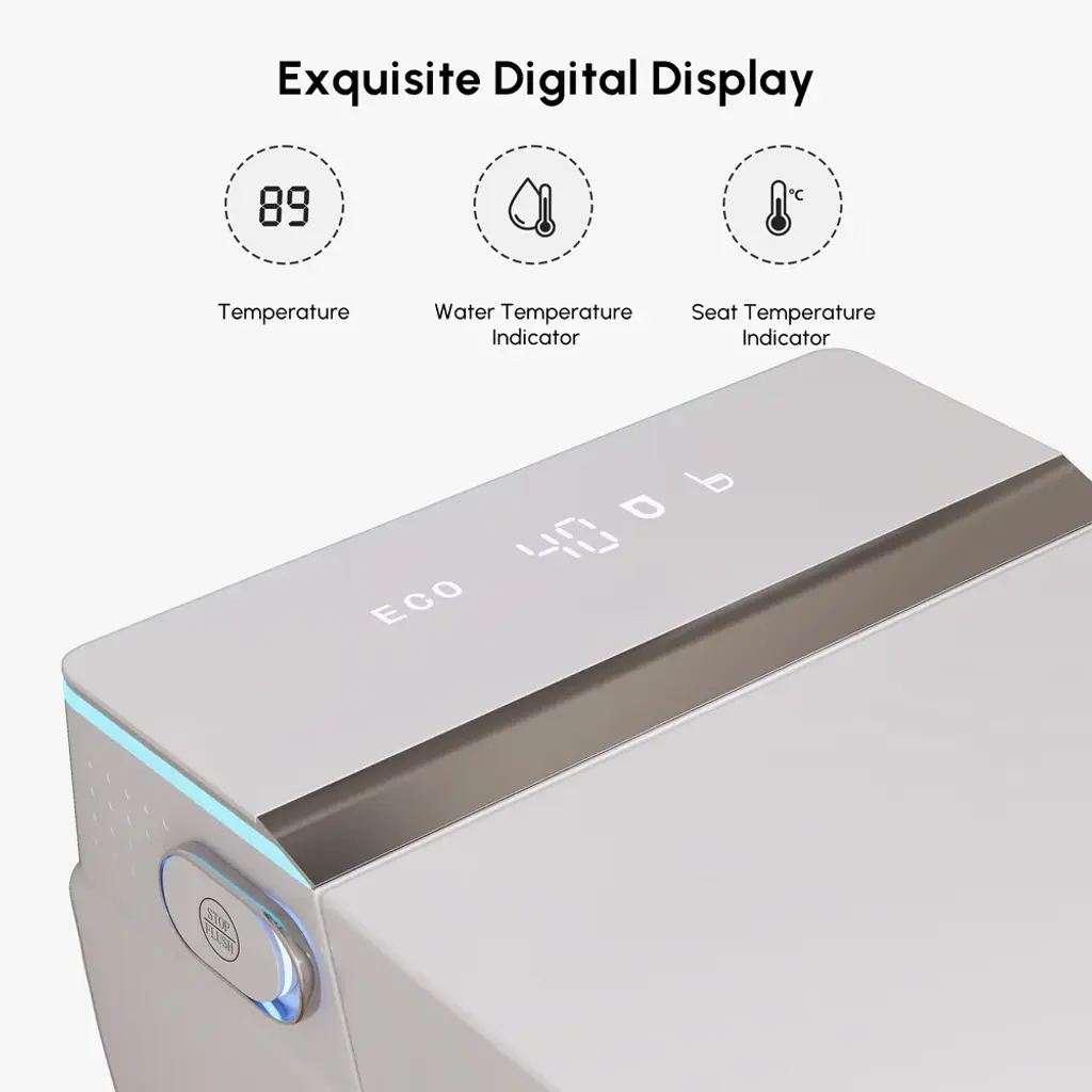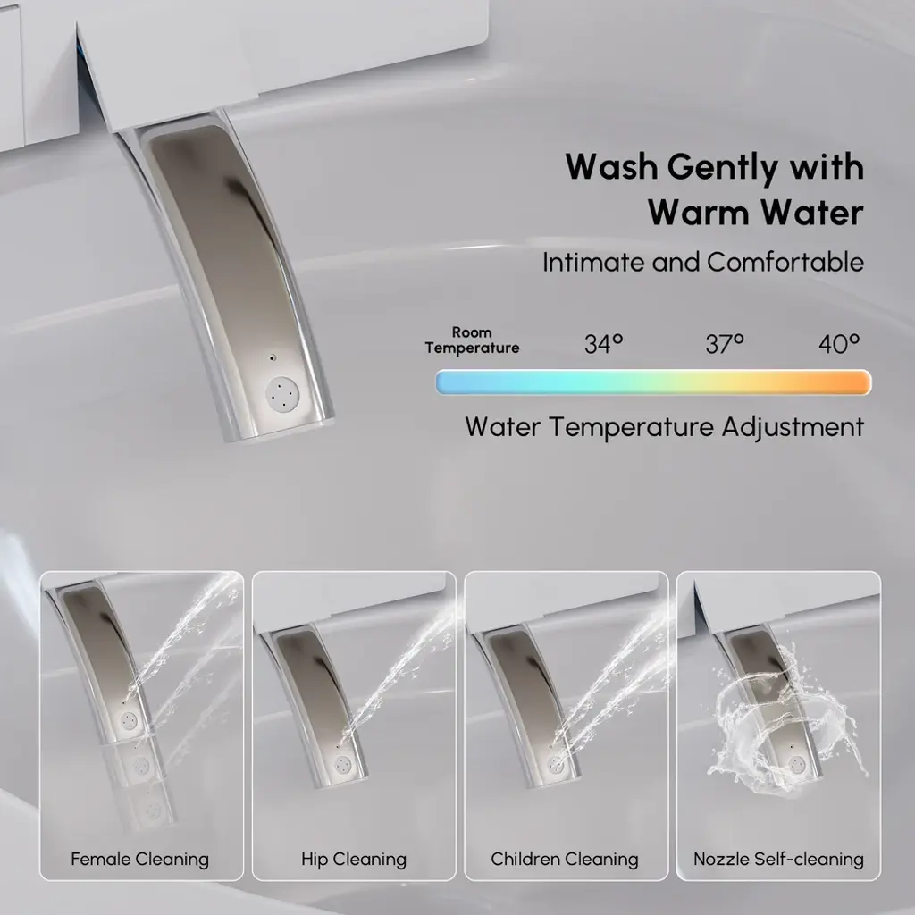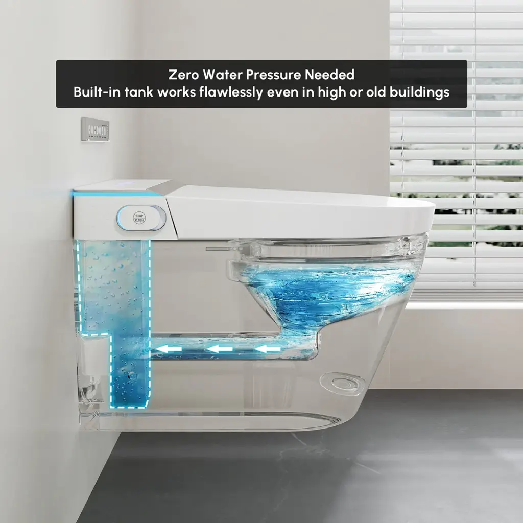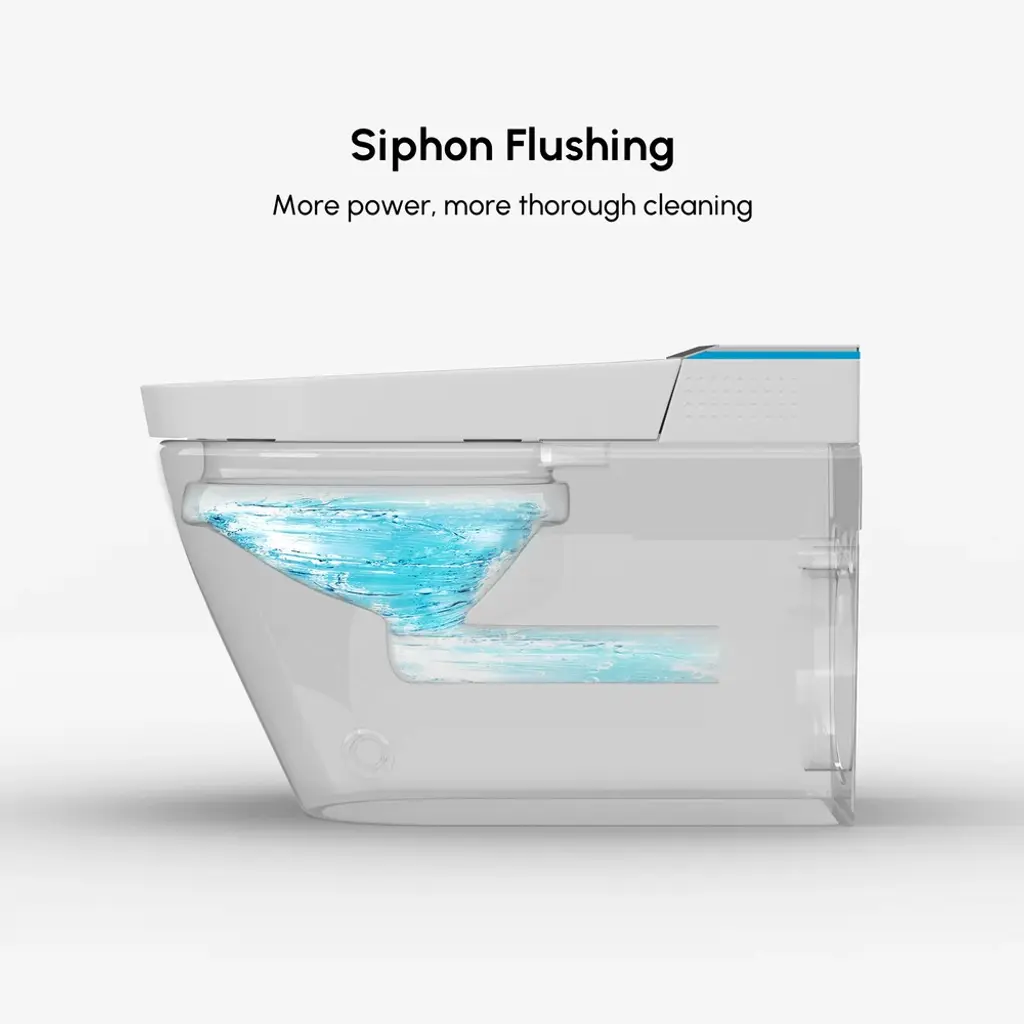 This wall-mounted Smart Toilet features innovative Foam Shield technology and auto-seasonal seat warming. With 4 water/4 air temp settings, self-cleaning nozzle, and built-in tank, it delivers premium hygiene without water pressure dependence. Remote control included.