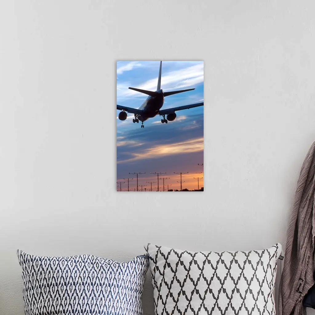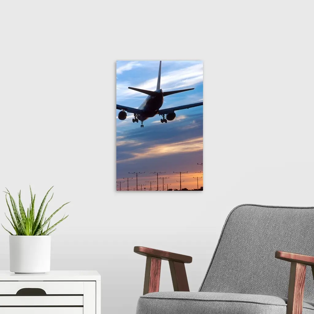 Airplane landing at LAX airport in Los Angeles, California at sunset.