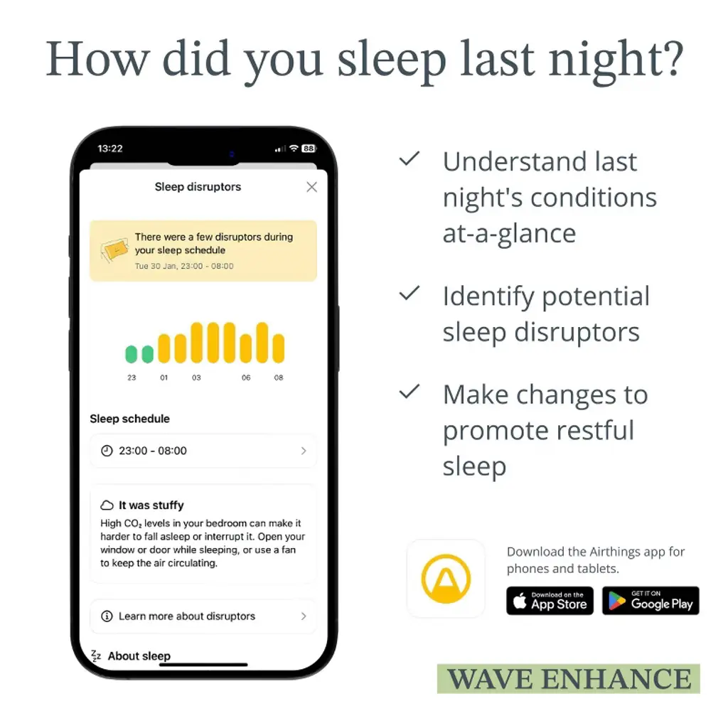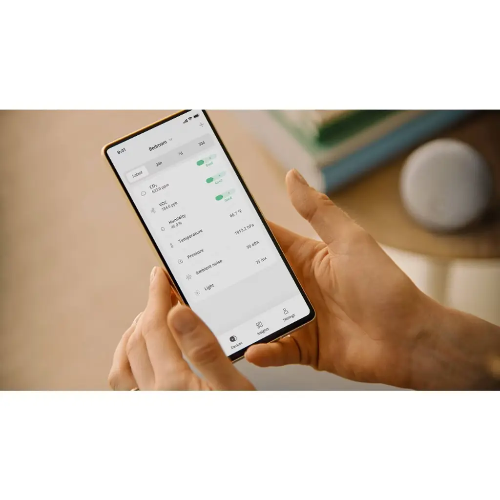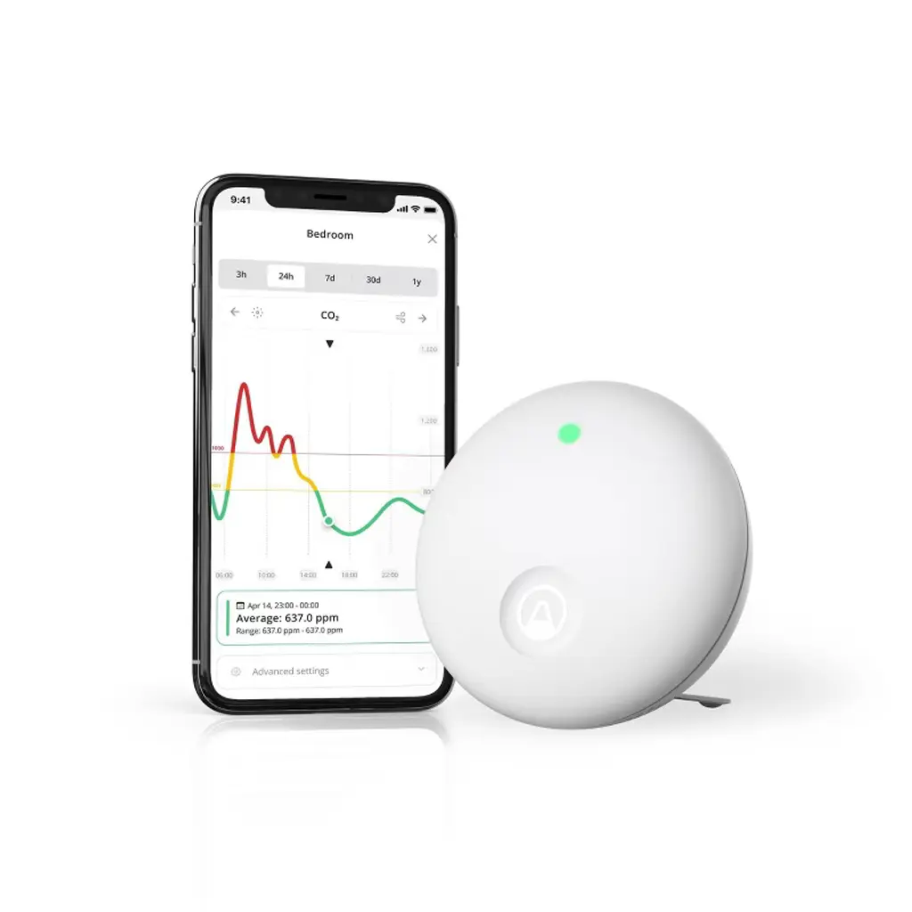 The indoor air quality monitor for bedrooms and home offices. Compact and discreet, it tracks the key aspects of a room's air and environment that affect your ability to sleep restfully and maintain focus. Equipped with Bluetooth, you'll get current readings and dynamic historical graphs in the Airthings app. No cables, AA batteries included.