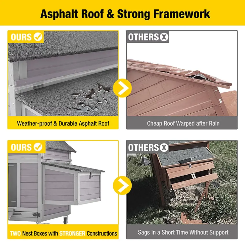 Give your chickens a large space for roosting and roaming in the Aivituvin chicken coop. The beautiful large coop offers your chickens plenty of room to roam in your backyard. The Aivituvin chicken coop gives your feathered friends a large and protected space to move around and enjoy happy, healthy lives in and out of the coop. The hutch provides plenty of room to rest and roost with three roosting bars and a triple nesting box.
