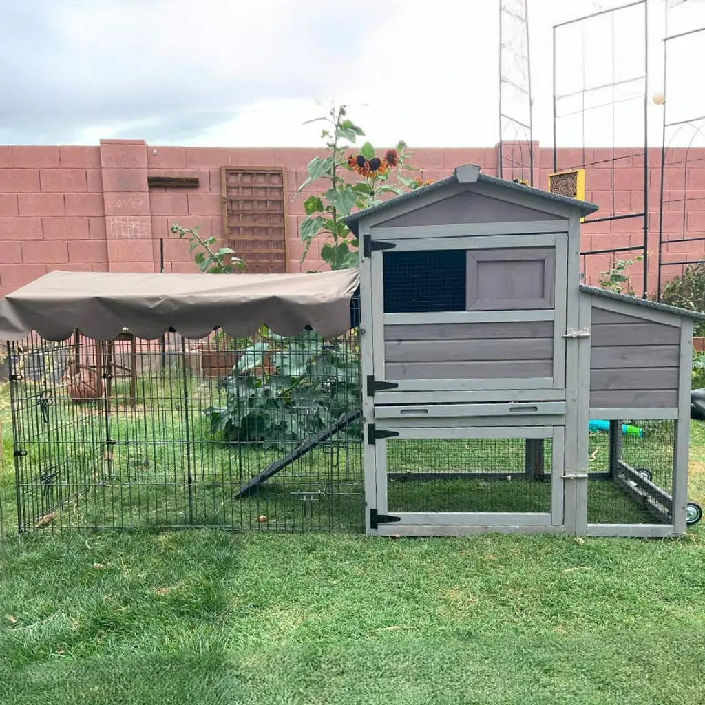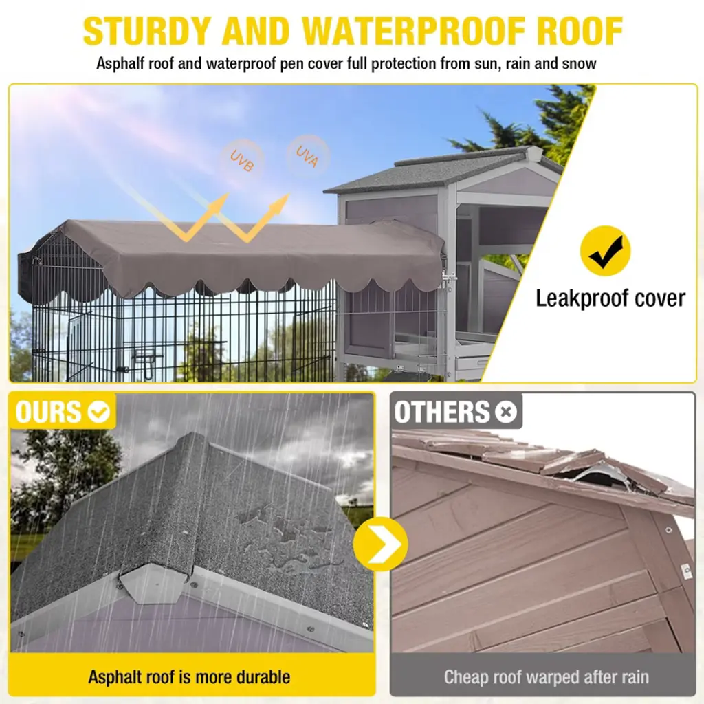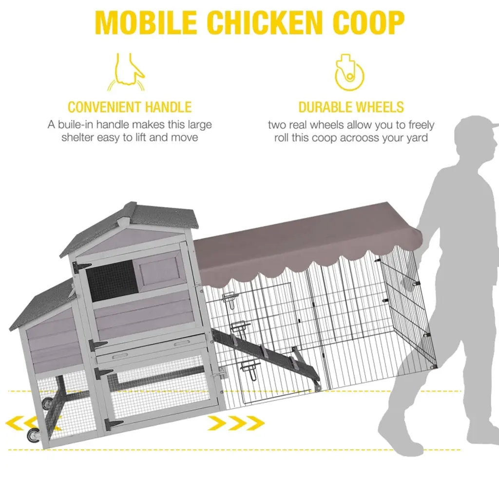 Upgrade your backyard farming game with the top-of-the-line Aivituvin AIR7008 Wooden Chicken Coop with Wheels. This coop was designed with your flock’s comfort and safety in mind. This durable and versatile coop is equipped with a range of features to ensure convenience and longevity, making it the perfect choice for pet parents looking to provide the best for their feathered friends. There’s a spacious metal run, so your beaked buddies have room to roam and exercise. The durable asphalt roof is designed to withstand the weather and protect your flock. Plus, there’s a pull-out tray so clean-up is a breeze.