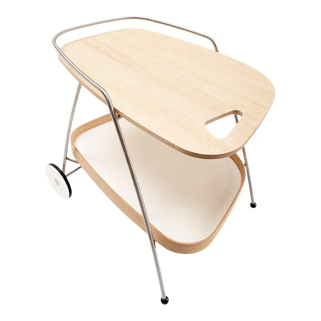 AK 700 Trolley Designer: Nissen & Gehl MDD Manufactured by: Naver Collection Stylish and light bar and serving trolley in stainless steel. The top in solid wood and the tray in laminate is a modern interpretation designed by Nissen & Gehl mdd. Use as a sculptural feature in the room or to serve a cafe latte or snacks and to always have a hand. The same colour is on the tray and on the wheels.