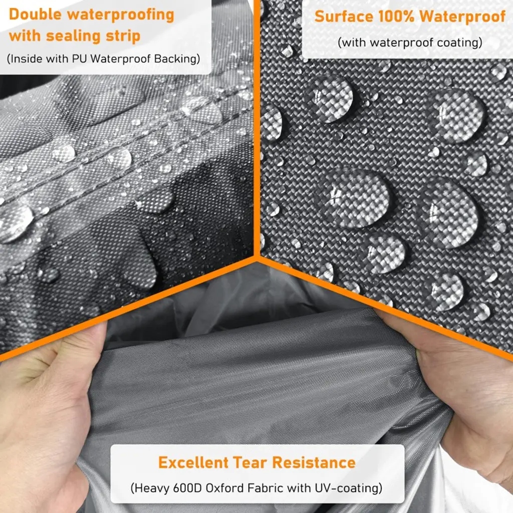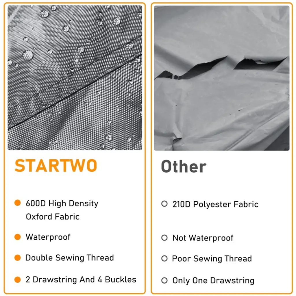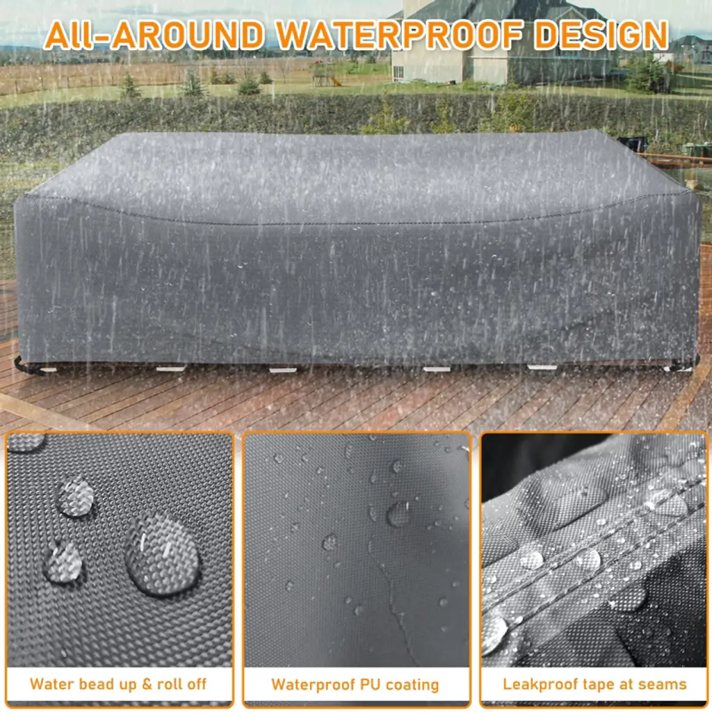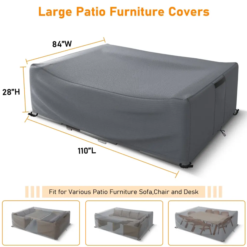 Protect your full outdoor furniture set with the Akefit patio cover, designed for maximum protection and clean style. Made from heavy-duty fabric with a waterproof PU coating and taped top seams, it guards against rain, UV rays, dust, and debris. Two mesh vision windows and upper vent flaps provide airflow and a modern look, while built-in side handles allow for easy removal. The cover stays secure with corner buckles and adjustable drawstrings on both sides. A matching fabric storage pouch with clean flap closure is included for tidy storage when not in use.