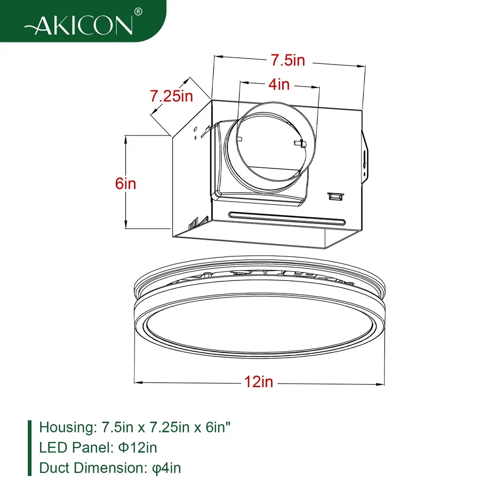 ULTRA-QUIET AND POWERFUL SUCTION - Akicon exhaust fan operates with 80 CFM at 2.0 sones which is ultra quiet and powerful to eliminate moisture and odors in the bathroom to ensure comfort in your home. It is powerful enough for rooms up to 75(Sq. Ft.) 3CCT LED LIGHT WITH NIGHT LIGHT - The bathroom vent fan with light can be customized your experience by choosing the color temperature in 3 options (2700K, 4000K, 5500K). And the 3.5W 2700K night light will help you to find your way through the room in the darkness. EASY INSTALLATION - The bathroom fans for ceiling is easy to install or replace existing product for DIY'ers with no attic access required. Housing Dimensions 7-1/2" x 7-1/4" x 6". Light Cover Size is Dia 12" . Click the installation guide on this page for more detailed and professional instruction. DECORATIVE - The modern design of Akicon's exhaust Fan is versatile enough to suit a wide range of bathroom styles. By using Akicon integrated Switch with humidity sensor(sold separately), you can effortlessly control the 3CCT light, night light and exhaust fan. HIGH QUALITY & PERFORMANCE - Be confident in the quality and construction of our products. The bathroom fan light combo is UL, HVI Listed and Energy Star Certified. All Akicon products come with a best-in-class customer service team to make your shopping experience smooth and comfortable. 3-Year Limited Warranty.
