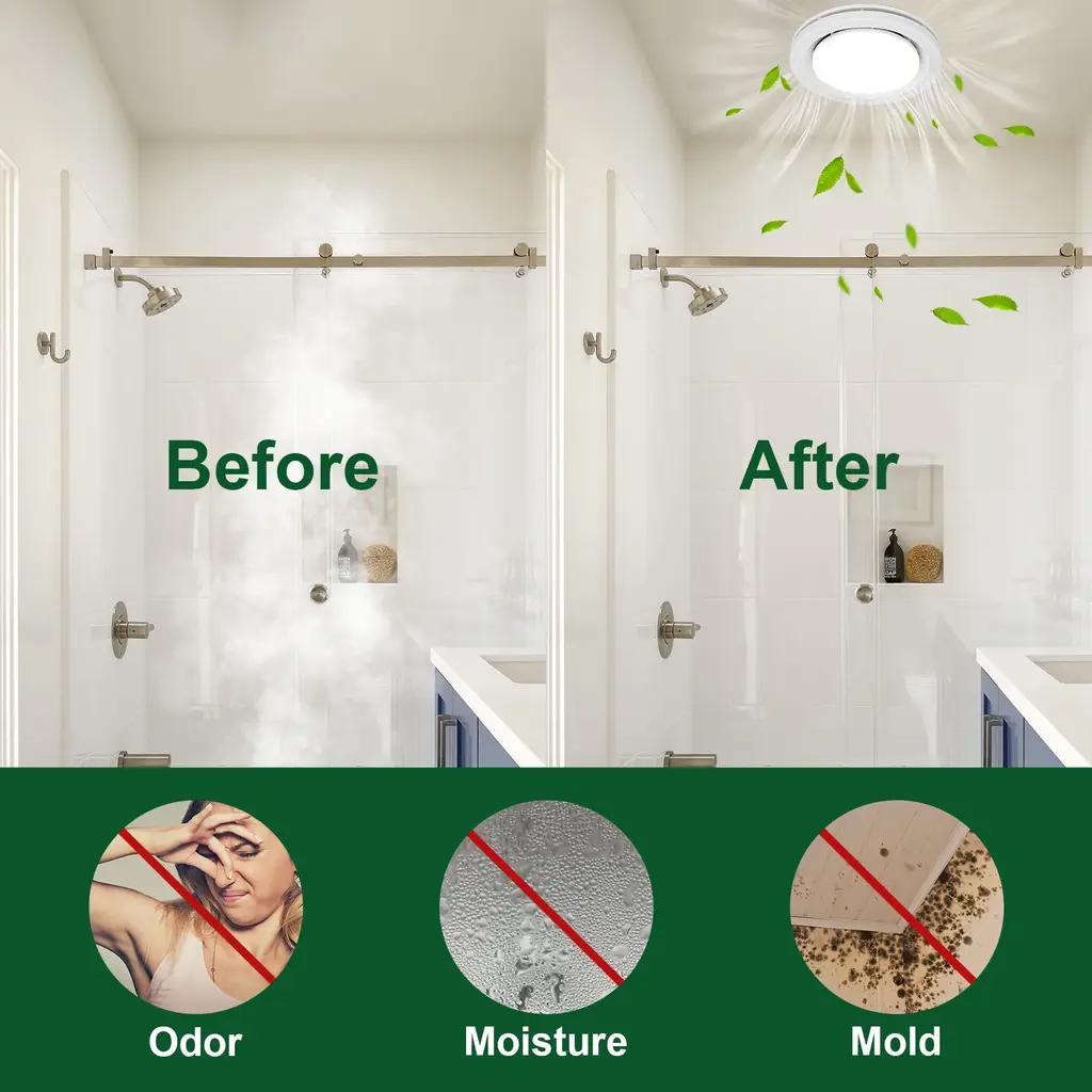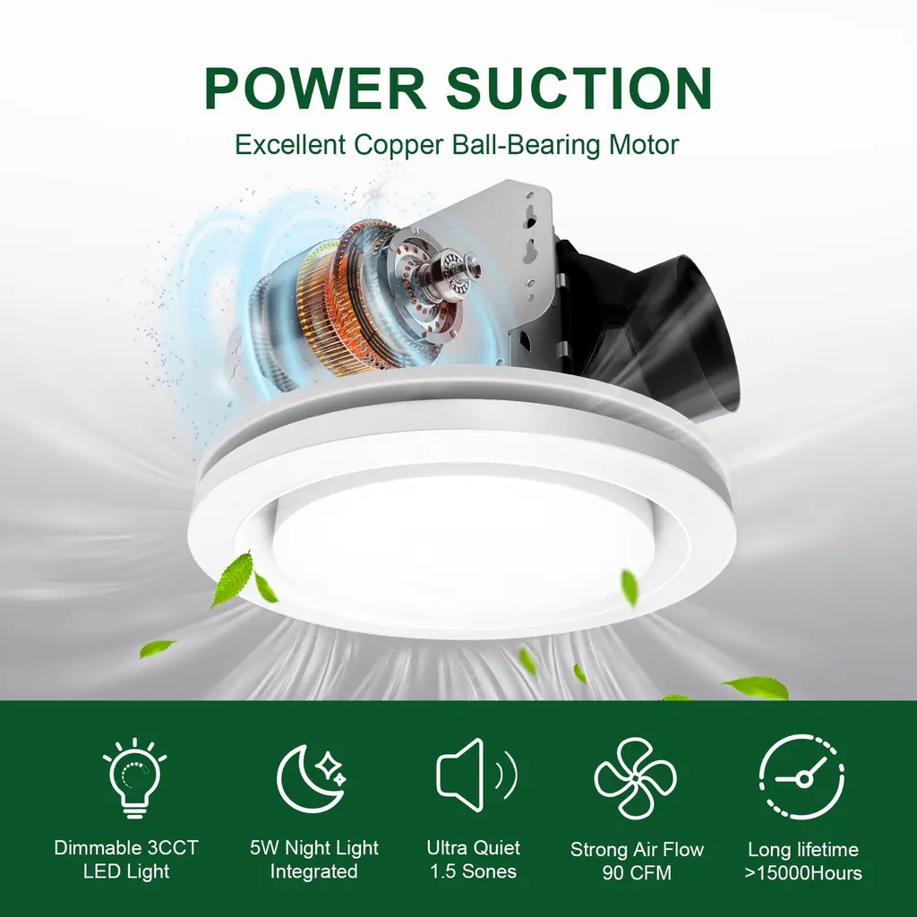 Stop dealing with that sticky, stale air and make your home the ultimate oasis of freshness with this ventilation fan. Pumps out 90 CFM of pure airflow, this exhaust fan efficiently removes humidity and the musty vibe that lingers after a steamy shower. Operating at just 1.5 sones, this bathroom fan ensures a quiet and peaceful environment without any annoying noise. Integrated 3 color temperature options, you can create the perfect ambiance in your bathroom or laundry room by simply controlling the on/off switch.FeaturesSpecification