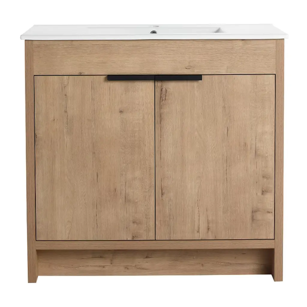 Elevate your bathroom aesthetics with the epitome of timeless elegance. This A. Walnut+Soft Black modern bathroom vanity seamlessly blends style and functionality to transform your space into a sanctuary of luxury. With its pristine Natural Oak basin and cabinet, it exudes a sense of purity and sophistication. The Natural Oak color palette creates a clean and airy atmosphere, making your bathroom feel bright and inviting.The double drawers maximize the use of space, offering a 20% increase in storage capacity to keep your bathroom essentials organized and within reach. And thanks to the DTC soft-closing silent drawer runners, you can enjoy a serene environment, free from disruptive noises. Featuring an integrated 45¡ã sloping handle-free design, it embraces a minimalist approach to design. The sleek Natural Oak cabinet enhances the visual appeal and creates a seamless look, adding a touch of modern refinement to your bathroom.