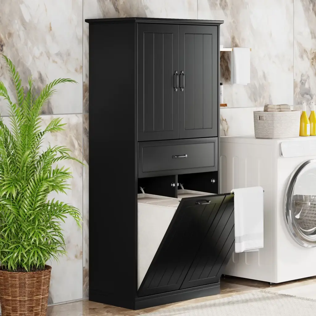 The main structure of this cabinet is crafted from high-quality medium-density fiberboard (MDF) to ensure stability and durability. Its smooth surface features water-resistant properties, making daily cleaning effortless. Silver bar-style metal handles and stainless steel hinges facilitate smooth door operation.