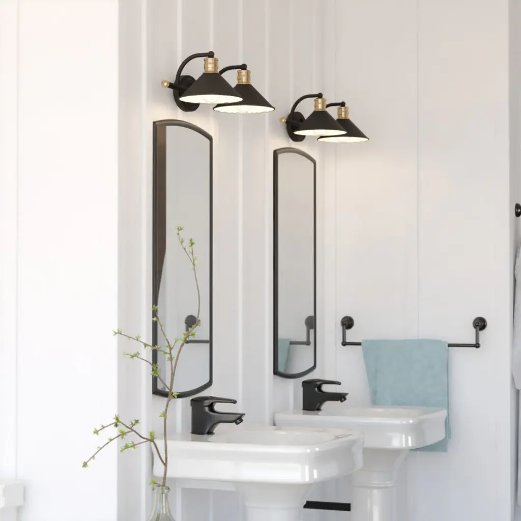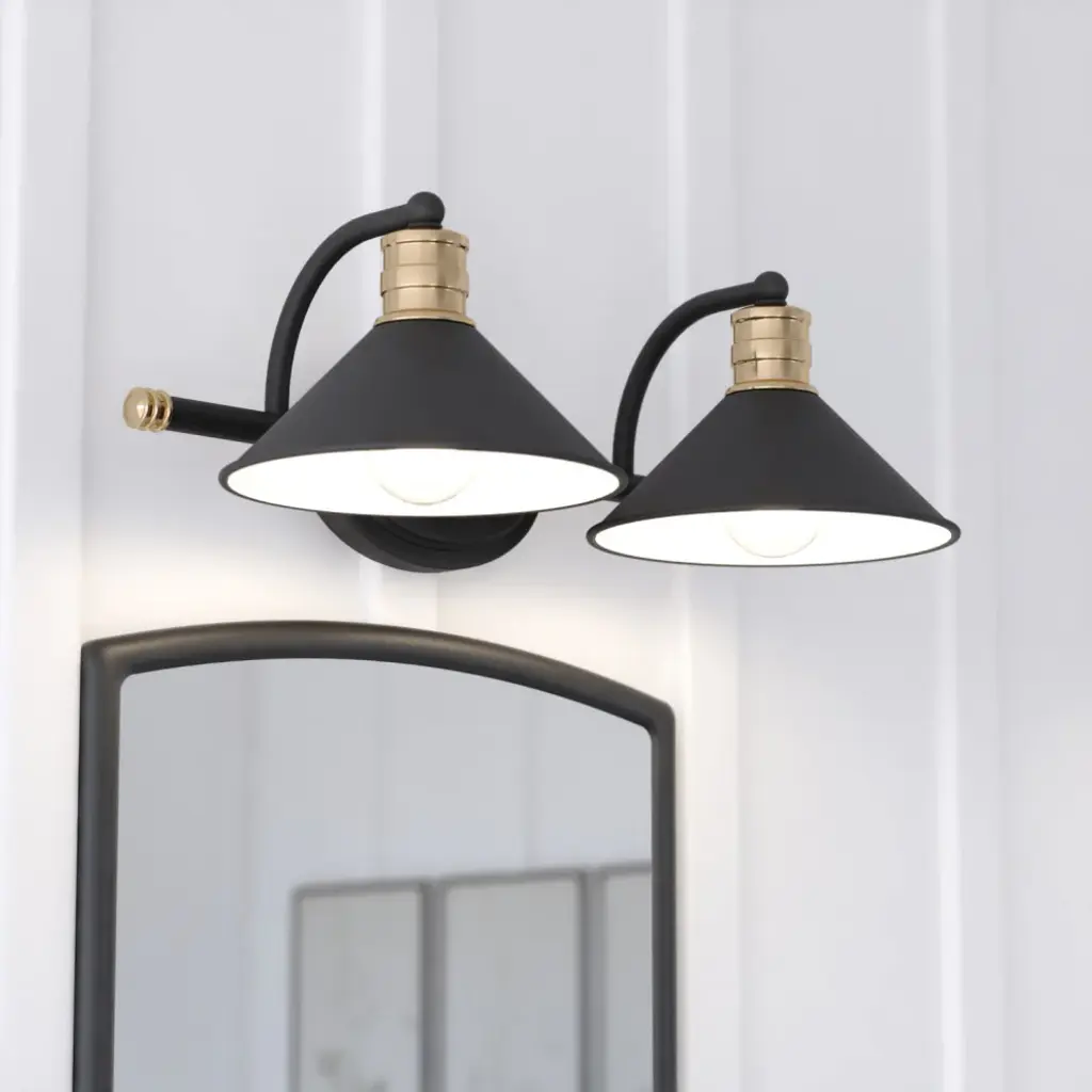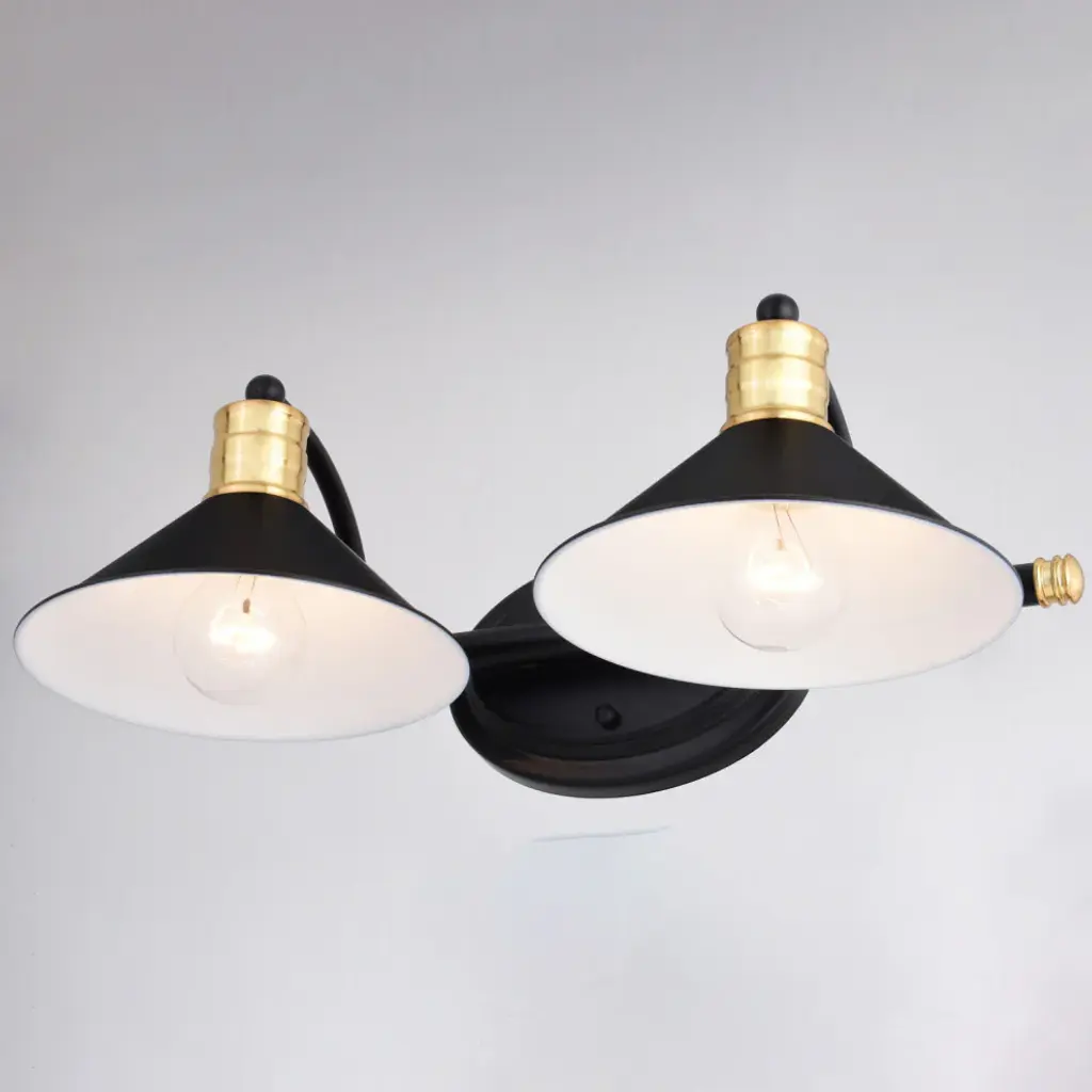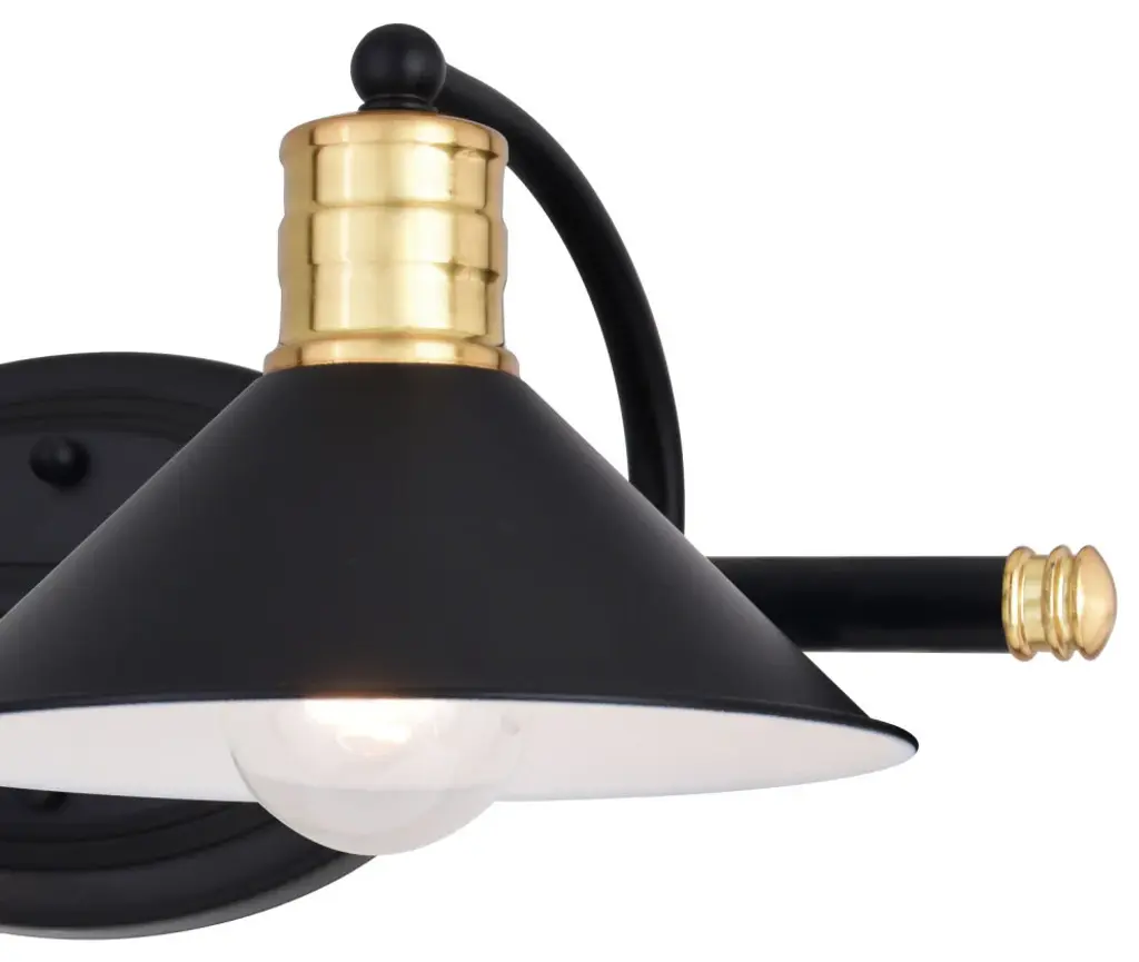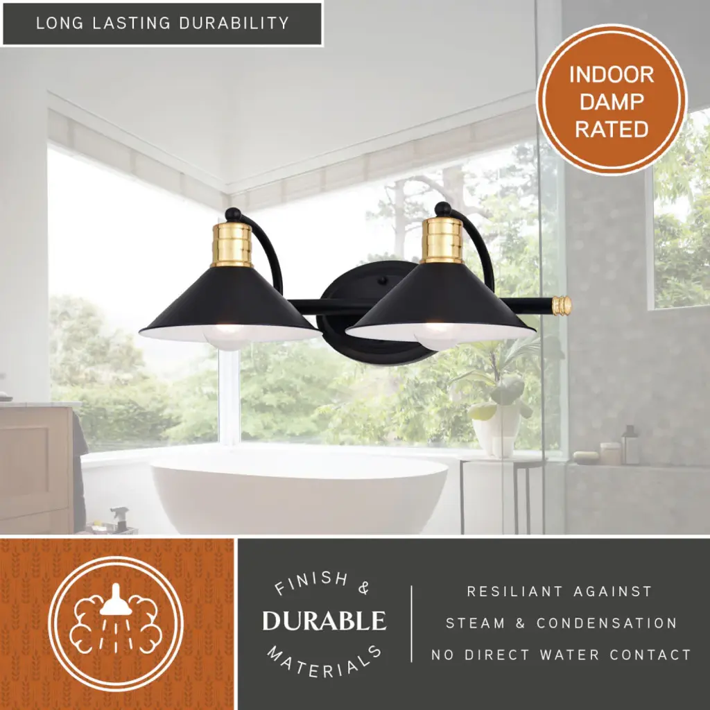 This modern soft industrial collection called Akron brings a level of sophistication to a trendy industrial or farmhouse style. The matte black and gold natural brass finishes complement the look of this lighting perfectly. The Akron collection is complete with a 2, 3, and 4 light vanity. Once you add this look to your home you will be pleasantly surprised as to how modern yet on trend your spaces look.FEATURES:Two-tone matte black and gold natural brass finish offers a distinctive look and quality steel constructionRound metal cone barn shade with white interior supports bright illumination and an industrial feelUses 2 x 100 watt E26 medium base bulbs (not included); LED compatible, dimmable for desired illumination levels when used with dimmable bulbs and compatible wall switch18-in W x 6.25-in H x 10-in DThis shaded down facing bathroom sconce is perfect over a small vanity mirror or as a pair over double sinksMounting hardware and instruction manual included for easy installationDamp rated; ideal for kitchens, bathrooms, or any other indoor area of your homeETL listing demonstrates this product has met requirements for product safety standards1 year limited warranty