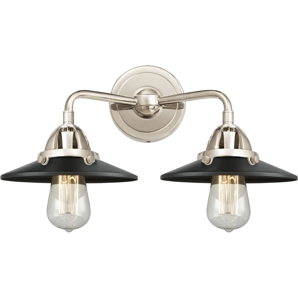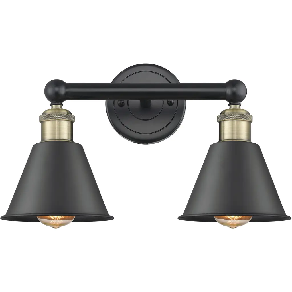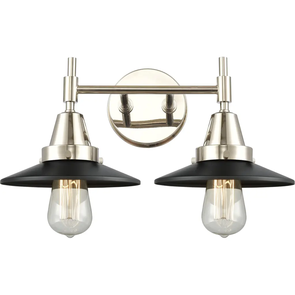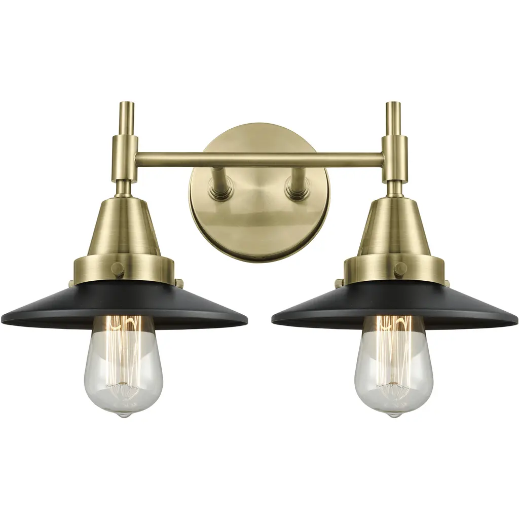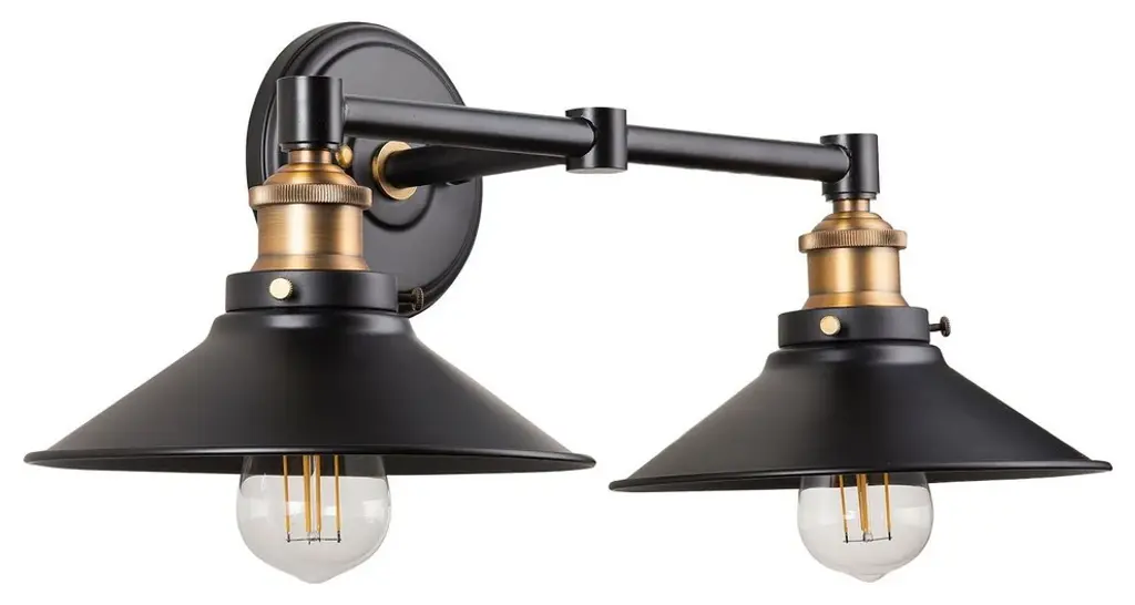 This modern soft industrial collection called Akron brings a level of sophistication to a trendy industrial or farmhouse style. The matte black and gold natural brass finishes complement the look of this lighting perfectly. The Akron collection is complete with a 2, 3, and 4 light vanity. Once you add this look to your home you will be pleasantly surprised as to how modern yet on trend your spaces look.FEATURES:Two-tone matte black and gold natural brass finish offers a distinctive look and quality steel constructionRound metal cone barn shade with white interior supports bright illumination and an industrial feelUses 2 x 100 watt E26 medium base bulbs (not included); LED compatible, dimmable for desired illumination levels when used with dimmable bulbs and compatible wall switch18-in W x 6.25-in H x 10-in DThis shaded down facing bathroom sconce is perfect over a small vanity mirror or as a pair over double sinksMounting hardware and instruction manual included for easy installationDamp rated; ideal for kitchens, bathrooms, or any other indoor area of your homeETL listing demonstrates this product has met requirements for product safety standards1 year limited warranty