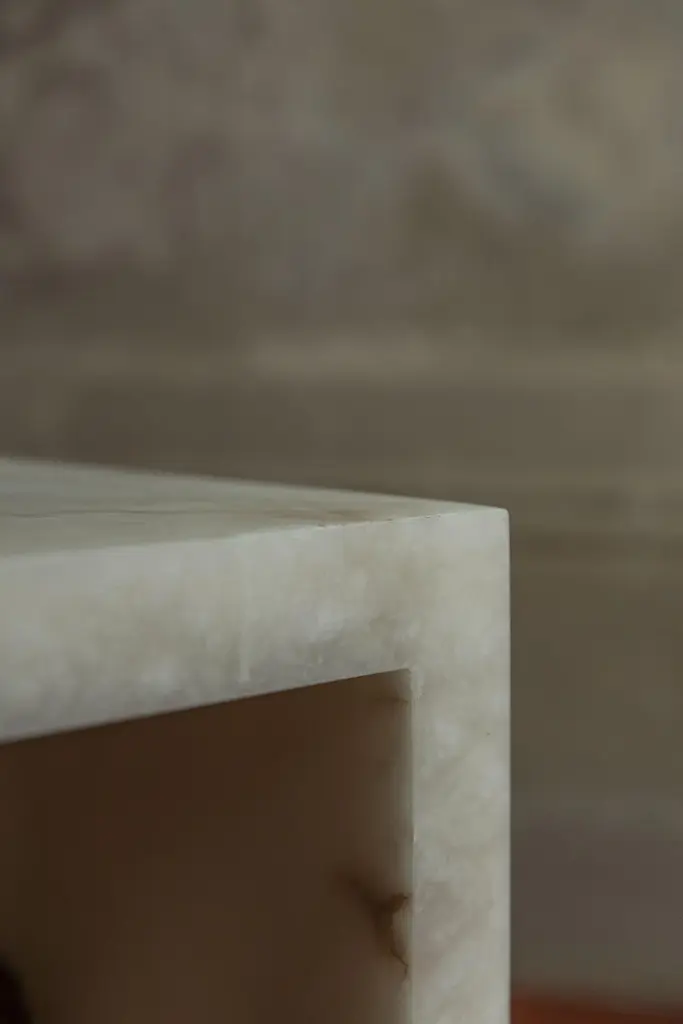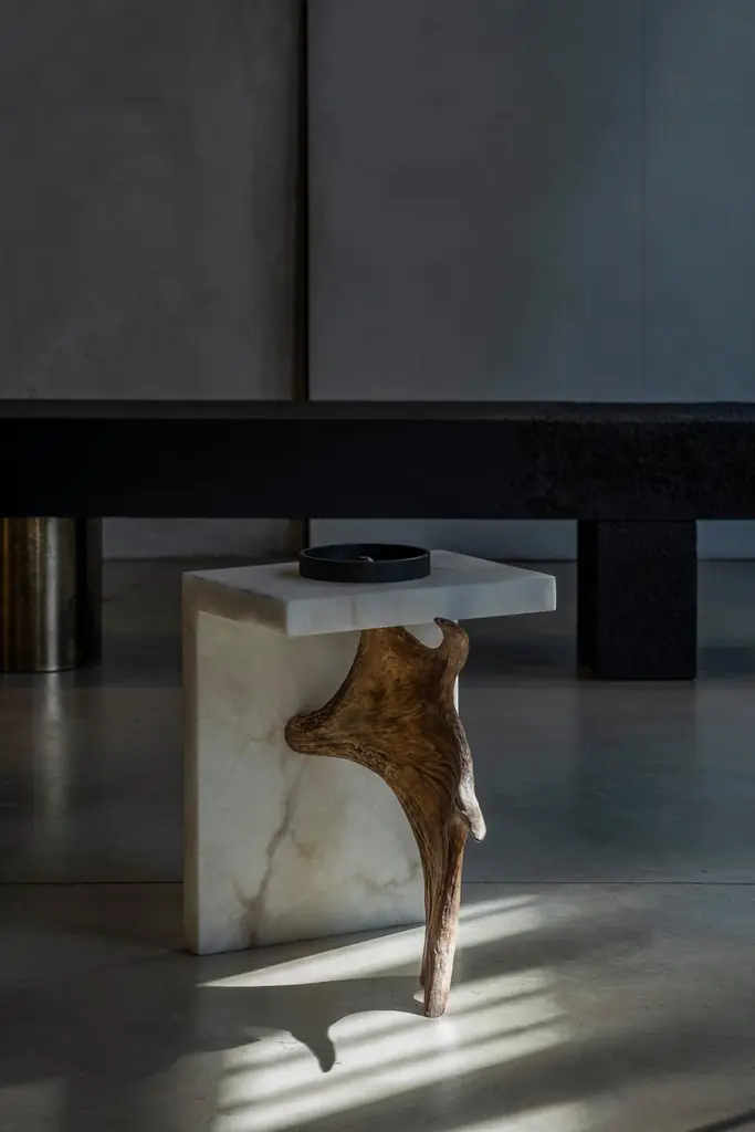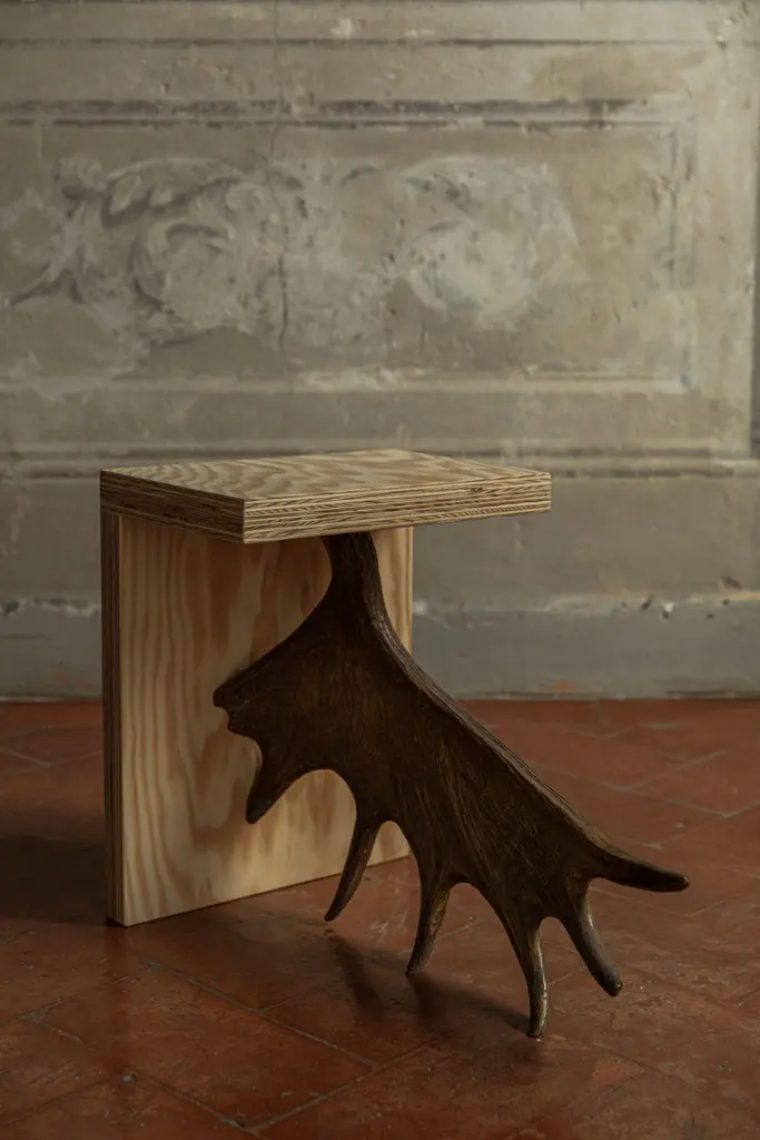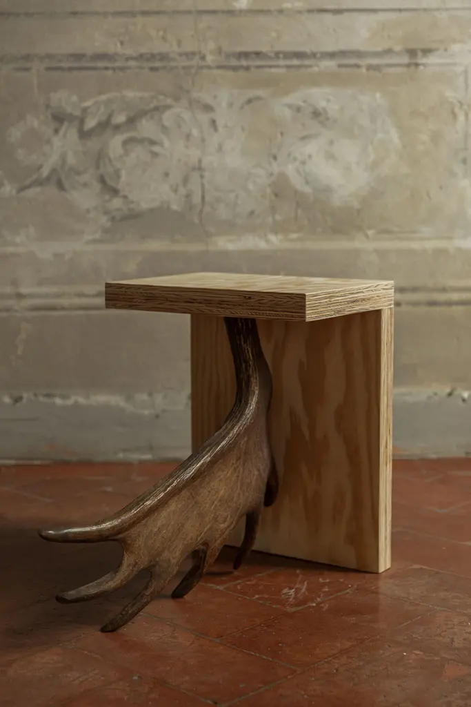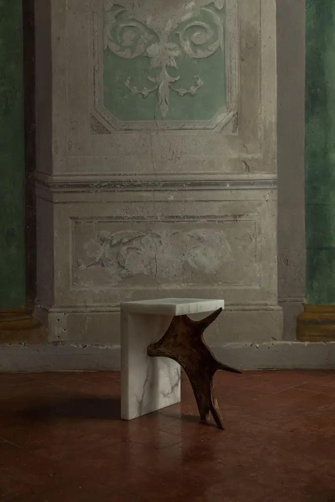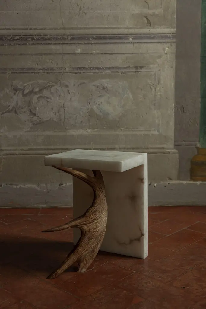 Alabaster Stag T by Rick OwensDimensions: L 55 x W 30 x H 44 cmMaterials: Alabaster, antler mooseWeight: 7.3 kgEach piece is unique and may differ as the Antler Moose is unique.Rick Owens is a California-born fashion and furniture has developed a unique style that he describes as “luxe minimalism.”Though his designs are simple and spare, Owens thrives on theatricality, producing wildly original runway shows featuring gender-fluid models of all ages and shapes. Inspired by his longtime partner and muse, Michele Lamy, clothes and furniture alike feature dark grays, blacks and browns. Like his frontier forebears, Owens finds his strongest influences in nature, his furniture and housewares have simple, organic shapes, and a few items even feature his distinctly 21st century take on antlers.