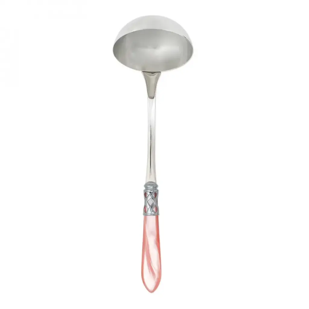 The Aladdin Brilliant Sauce Ladle features elegant pearlized handles with the strength of high-grade acrylic and 18/10 stainless steel. This piece is also available in our antique finish. Since 1983, Vietri has specialized exclusively in Italian handcrafted ceramics, stainless and pewter flatware, mouth blown glassware, lamps, urns and planters. Families of artisans with 3 or 4 generations of history create these special pieces using centuries-old techniques. The subtle color from a paintbrush and the curving stroke of the artist's hand are never repeated in quite the same way, making each piece truly unique.
