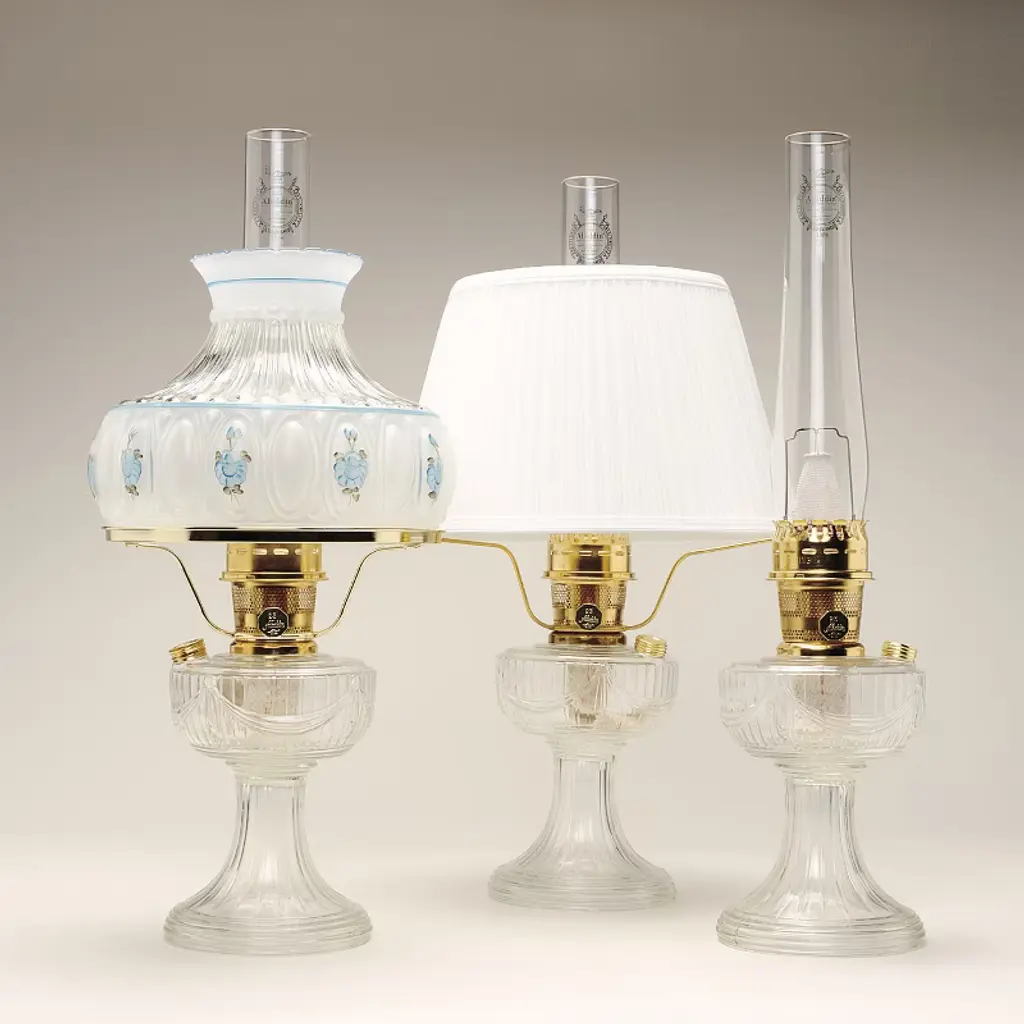 It's easy to see why Aladdin's Lincoln Drape lamps are favorites of collectors worldwide. The sweeping, dramatic font designs give them a Civil War-era flair and a valuable, antique feel. This design still looks stunning (and works beautifully!) in any modern home and features a clear glass font that's made near our store. Burn time: 10-12 hours per fill. Fuel Capacity: 32 oz. 24"H. Burn time: 10-12 hours per fill. Fuel Capacity: 32 oz. Dimensions: 24"H. IMPORTANT: We recommend using only Aladdin lamp shades with your Aladdin lamp. Generally, Aladdin lamps produce more heat, which other shades may not be able to withstand and, as a result, break.