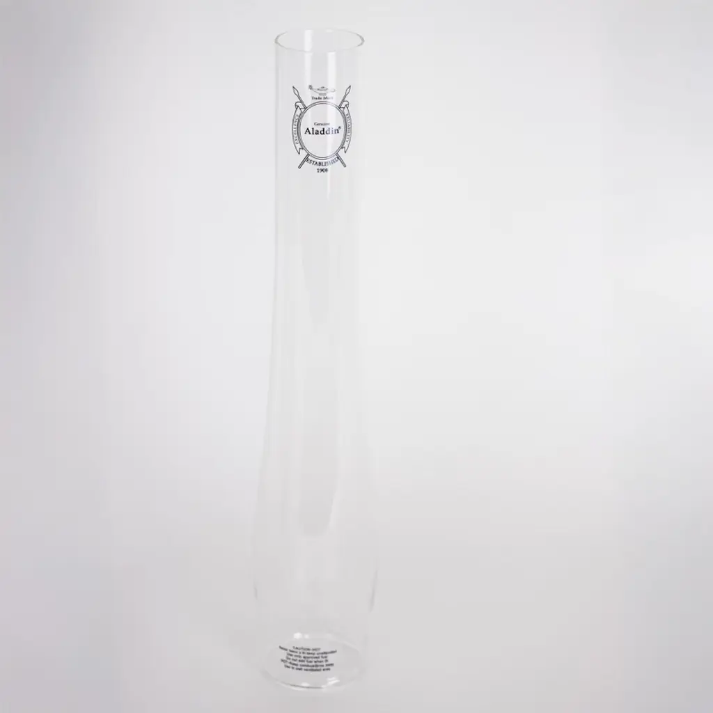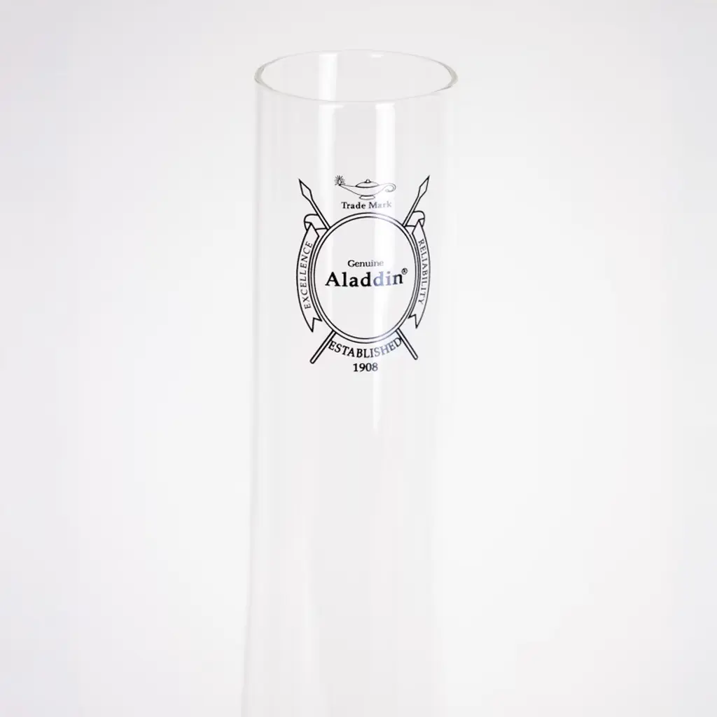 New high output chimney is 3" taller than a standard chimney. The increased height means more oxygen is drawn over the flame, resulting in up to 20% more light. Aladdin's exclusive borosilicate glass is shatter resistant and can withstand immense heat. All chimneys carefully inspected and are free of bubbles and other defects. It's the finest lamp chimney available! 15-1/2"H, 2-5/8" OD base. China. IMPORTANT: High Output Chimney is required at altitudes above 4,000 ft. Note: Logo on chimney is white. Measurements are approximate and can vary slightly. Find the Right Fit! "Lox-On" Chimney: Fits lamps made between 1932 and 1983, models 12, 21, 21c, 23, A, B, C).