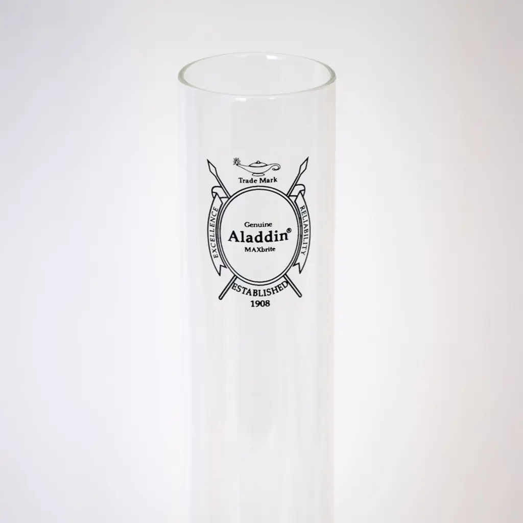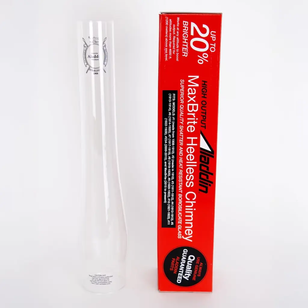 New high output chimney is 3" taller than a standard chimney. The increased height means more oxygen is drawn over the flame, resulting in up to 20% more light. Aladdin's exclusive borosilicate glass is shatter resistant and can withstand immense heat. All chimneys carefully inspected and are free of bubbles and other defects. It's the finest lamp chimney available! 15-1/2"H, 2-5/8" OD base. China. IMPORTANT: High Output Chimney is required at altitudes above 4,000 ft. Note: Logo on chimney is white. Measurements are approximate and can vary slightly. Find the Right Fit! MAXbrite (Heel-less) Chimney: Fits all models except 12, 21, 21c, 23, A, B, C.