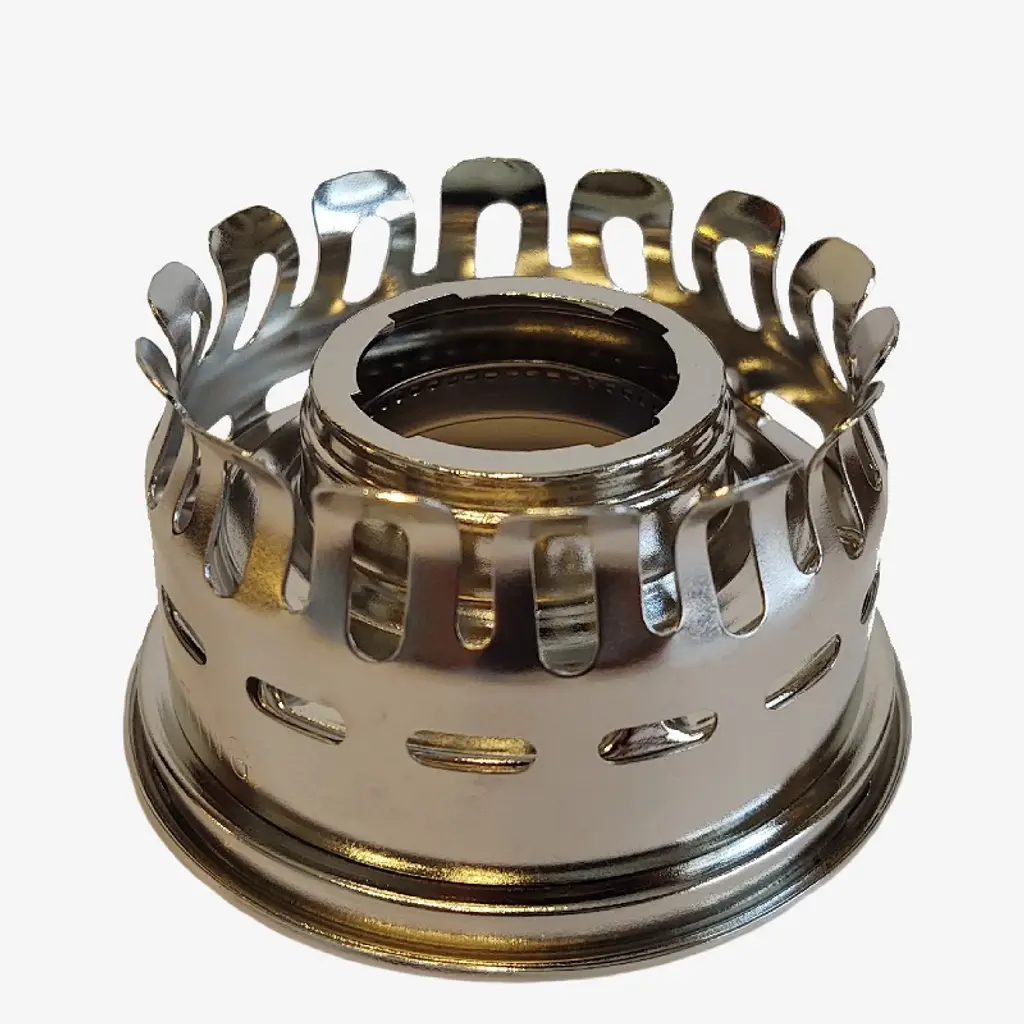 An Aladdin heelless gallery, also known as a "heelless lamp chimney" or "Aladdin lamp chimney," is a specific type of chimney designed for Aladdin lamps. Aladdin lamps are a brand of pressure lamps that use a mantle to produce a bright, white light by burning kerosene or other fuel. The heelless gallery refers to the design of the bottom part of the chimney, which lacks a protruding lip or "heel" that is commonly found in traditional lamp chimneys. The absence of a heel in the gallery allows for a more efficient and consistent airflow, which is crucial for the proper operation of the Aladdin lamp. This design feature ensures that the mantle receives the correct amount of oxygen for combustion, resulting in a brighter and more consistent light output. Overall, the heelless gallery design is a key feature of Aladdin lamps, contributing to their reputation for providing reliable and high-quality lighting solutions.Fits all currently produced burners, and all burners since 1917. Accepts only heel-less chimneys (lox-on galleries no longer produced). Nickel.