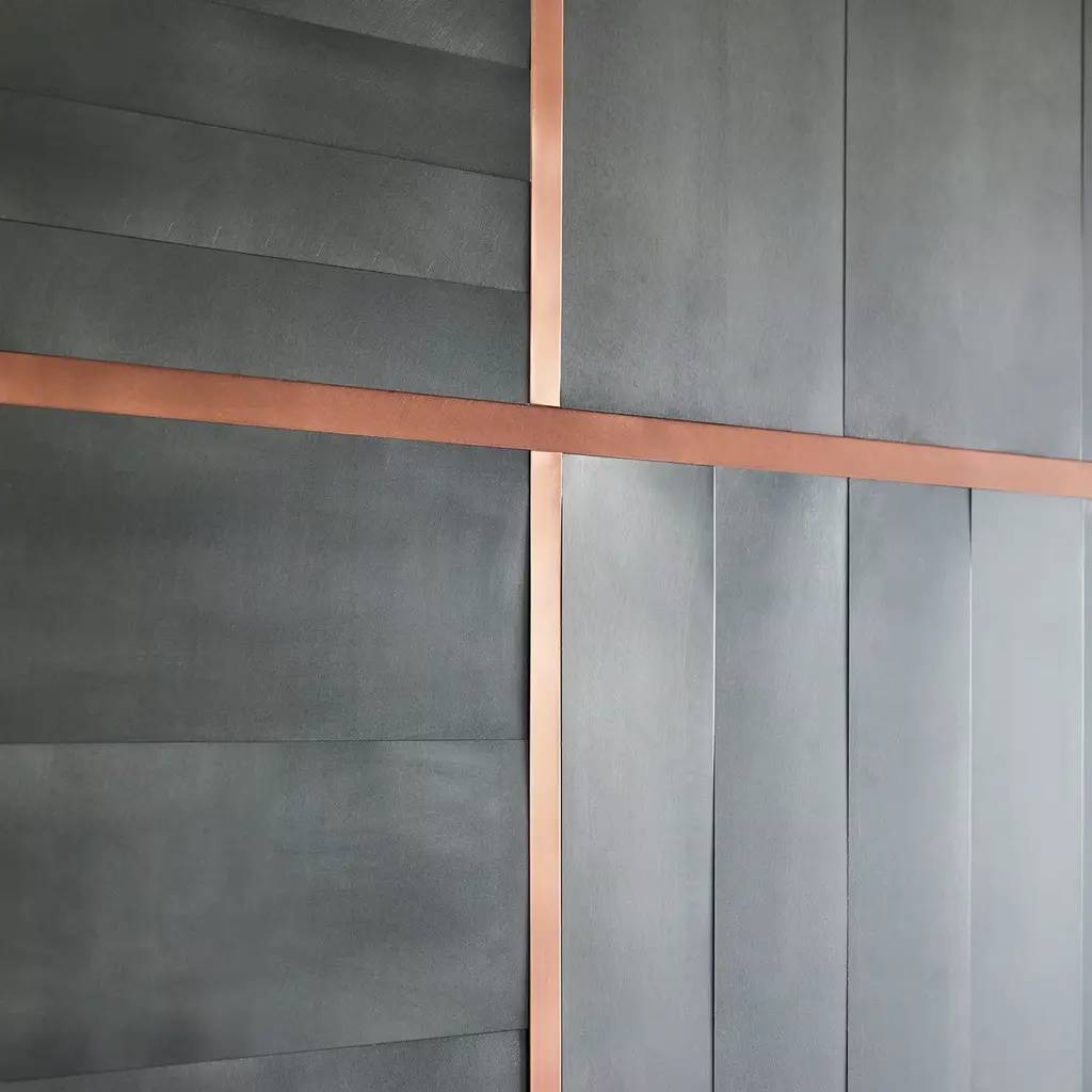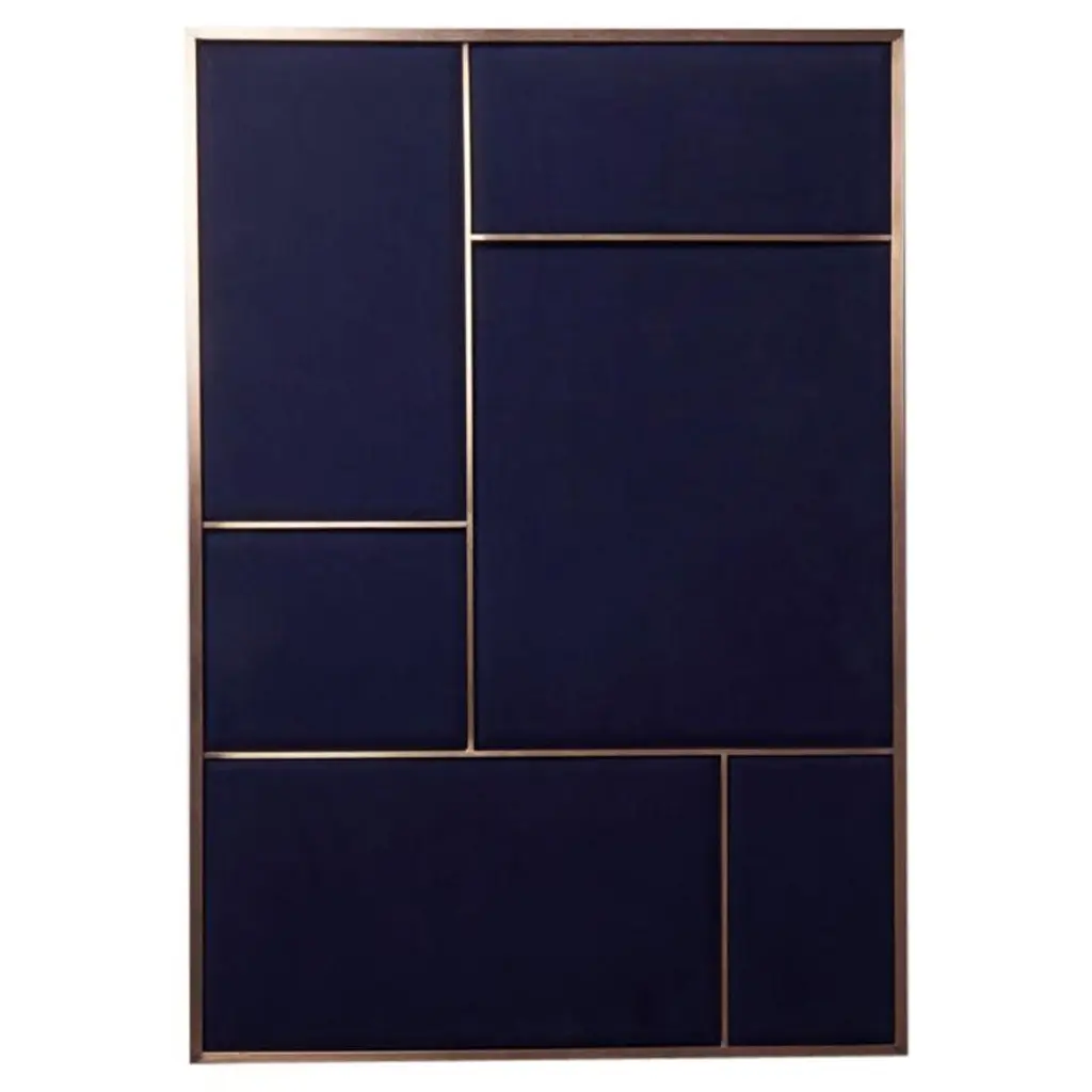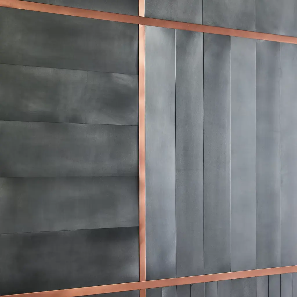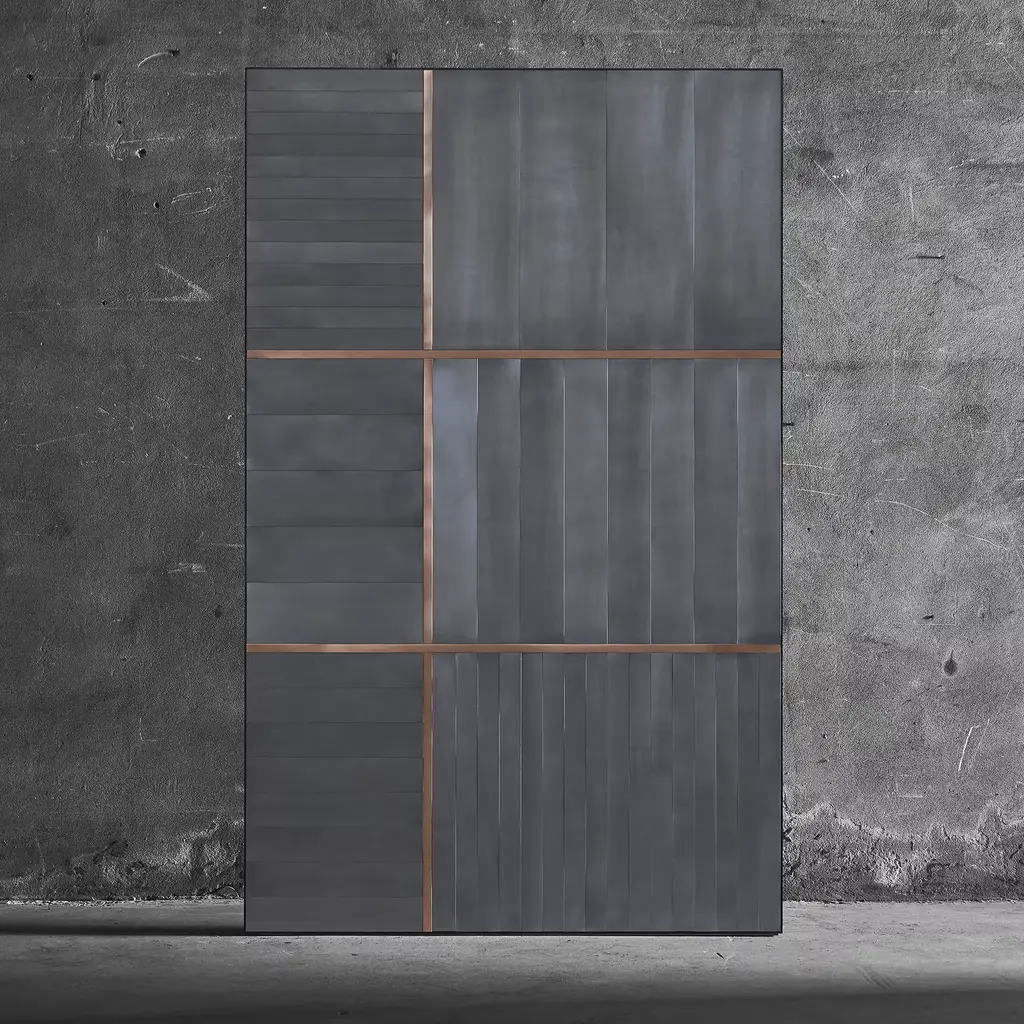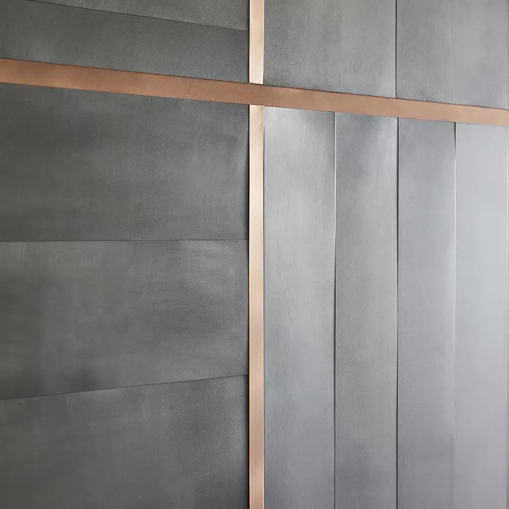 Part of a new collection presented at Fuorisalone during 2018 Milan Design Week, this spectacular wall cladding transforms a purely geometric pattern into a three-dimensional sculptural piece. Ideal to decorate any interior with elegance, this geometric design is inspired by the textile work of Anni Albers, a well-known designer and teacher at Bauhaus. The multiple rectangular segments of the brass-colored lines create a continuous and animated graphic over a charcoal background, evoking a fabric-like surface that transforms any wall into an architectural, contemporary surface.