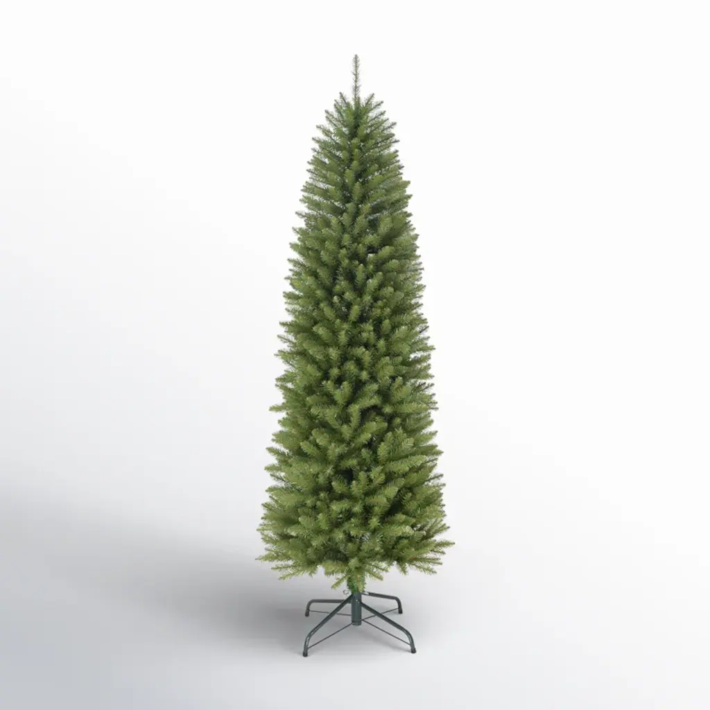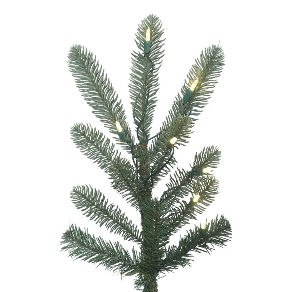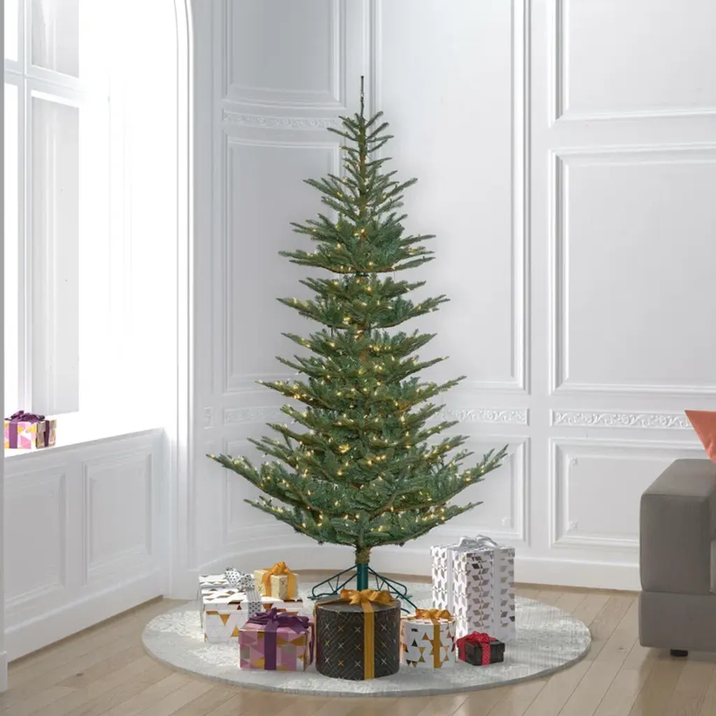 Holiday helper. Simple to assemble + pre-stung with white lights, this faux blue spruce tree delivers Christmastime convenience, year after year. It showcases evenly-spaced branches with lush, lifelike needles. The slender silhouette leaves plenty of space for presents + gathering ‘round.