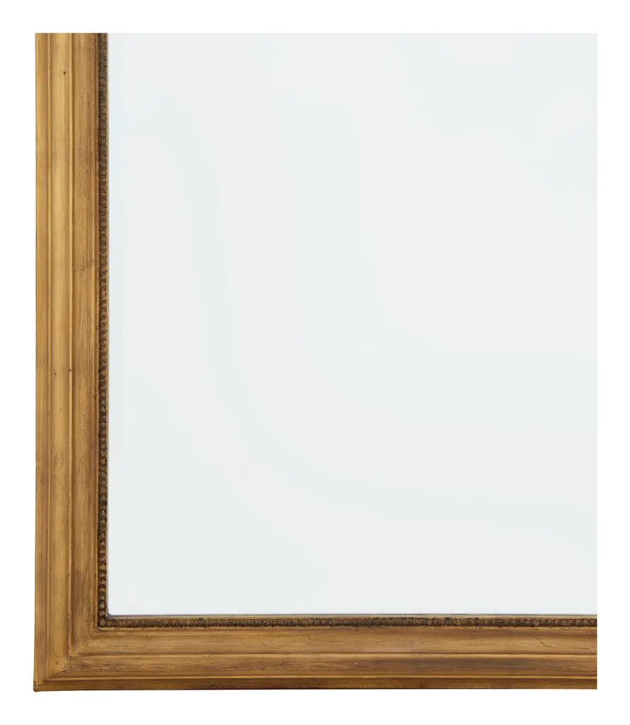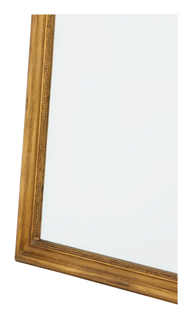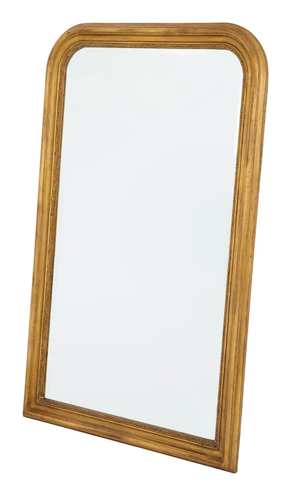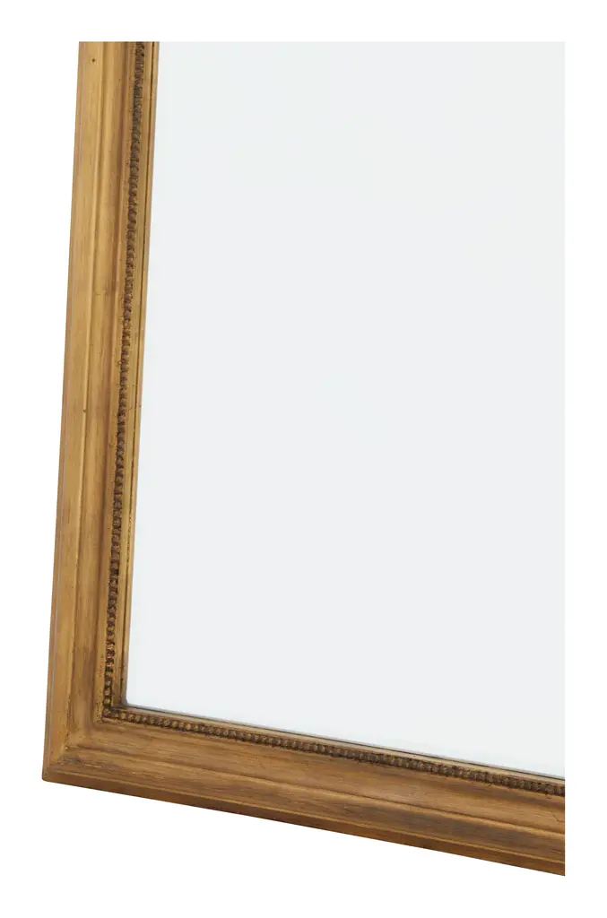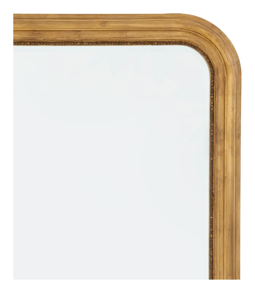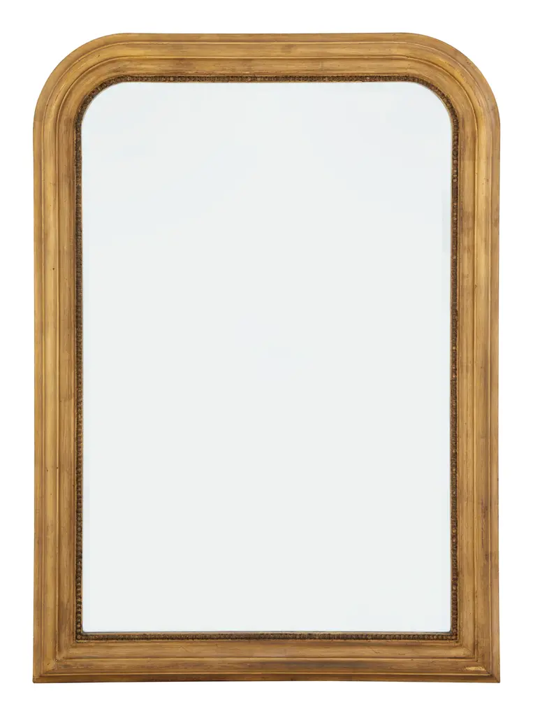 Give your walls the royal treatment with our lavish Albion Mirror. Taking its cue from the grandiose designs of the Rococo period, this beveled glass mirror is enclosed in an arched pine wood frame, which is decorated with beaded details along its interior edge and covered with a gilded finish for a bit of antiqued shine. As if these classic good looks weren’t enough to have you swooning already, Albion is also available in two sizes — meaning there’s truly one for any space. Style a medium over the mantel for a touch of old-world sophistication; or stage the full-length large in a bedroom or grand entryway, where it can add an element of history and elegance to all your “fit checks.” •beveled glass•pine wood•gilded finish•wire mount Dimensionsmedium: 35.5"W x 2"D x 47.75"H large: 39.25"W x 2"D x 61.5"H