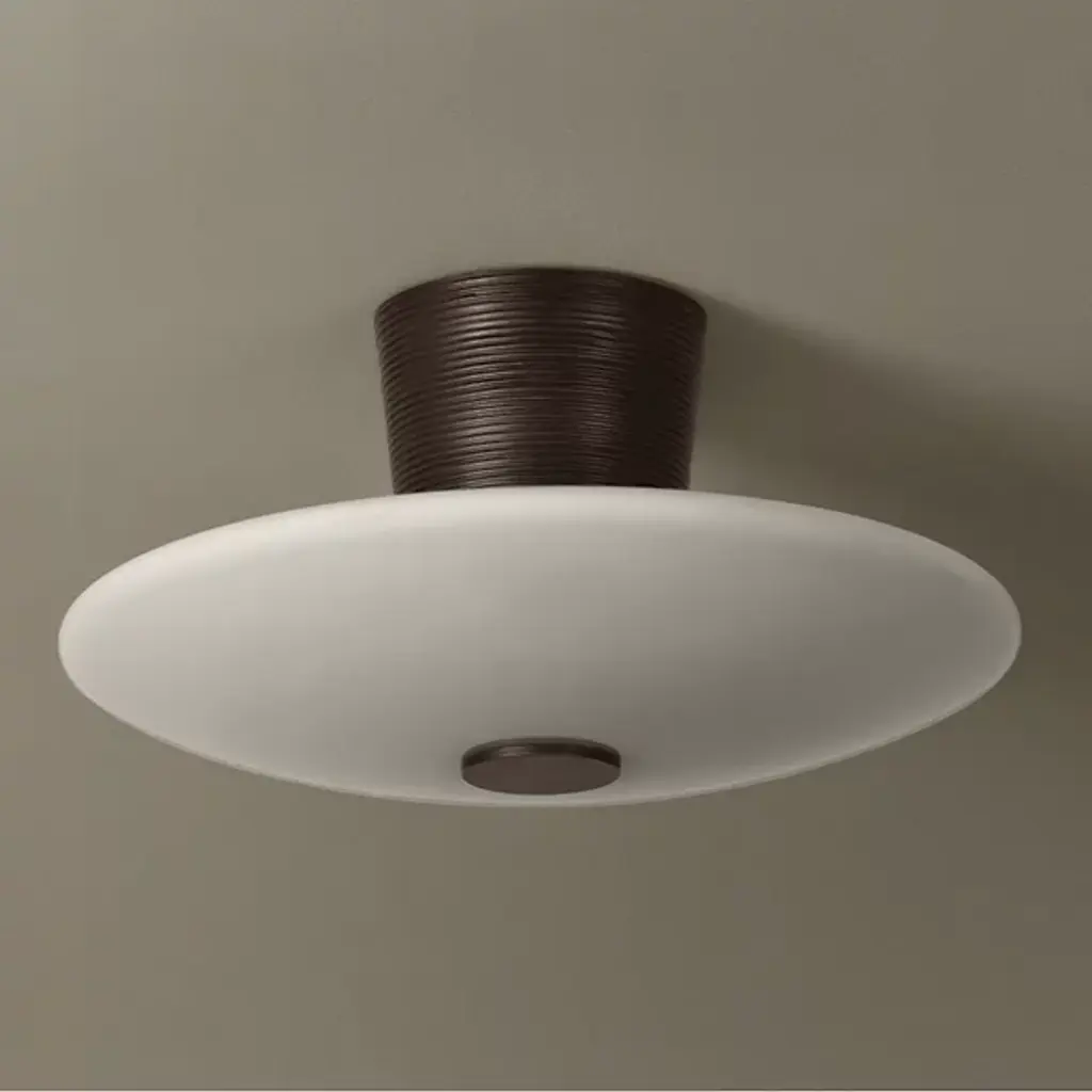 The Albus LED Semi Flushmount from Troy Lighting exhibits clean, geometric design complemented by striking textural ribbing details on the wide stem. The slightly dished shade emits broad, atmospheric light free from harsh glare, while a central, contrasting piece adds visual interest to the composition. Soft light washes upward over the stem, highlighting the unique surface texture. This ceiling fixture combines geometric precision with tactile materials, resulting in overhead lighting that provides both ambient illumination and architectural presence through its refined proportions and material contrasts.