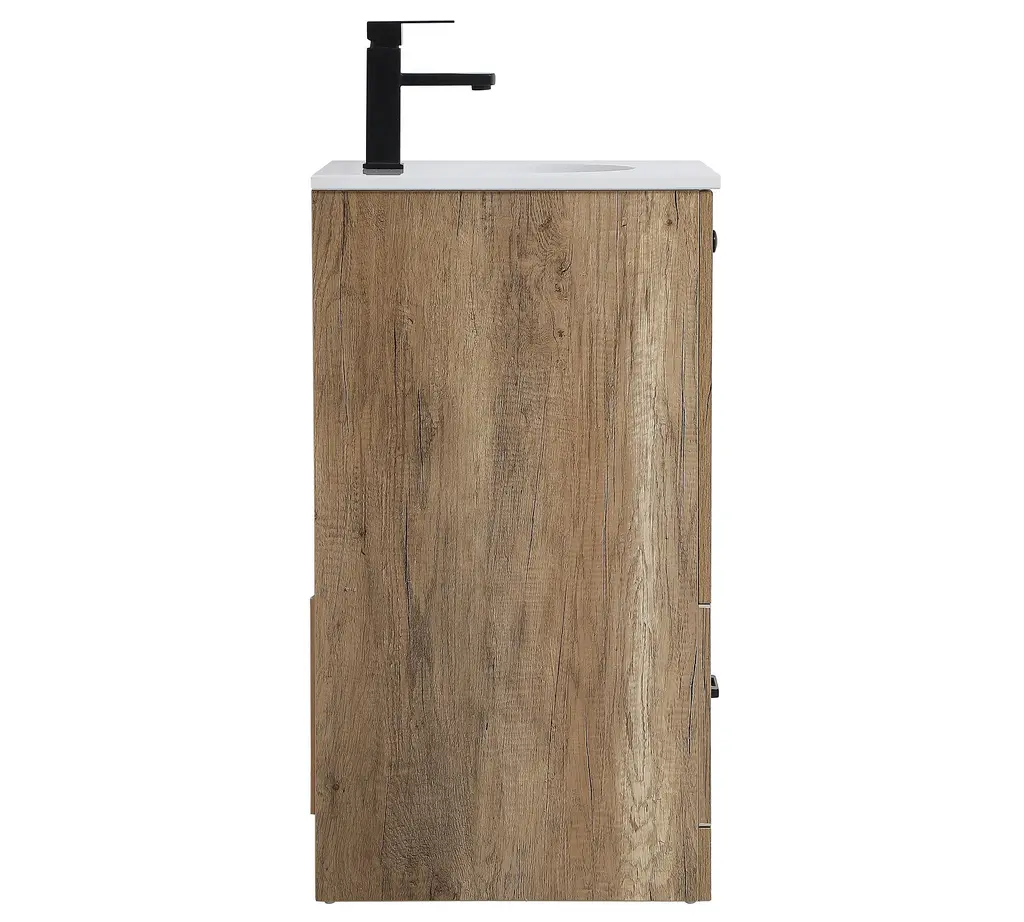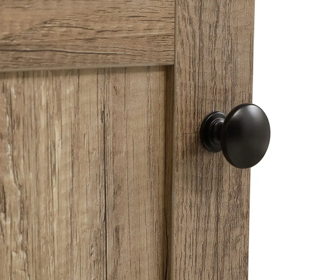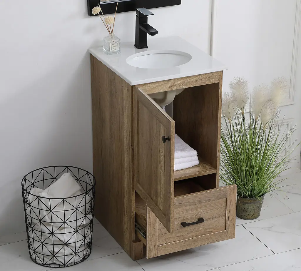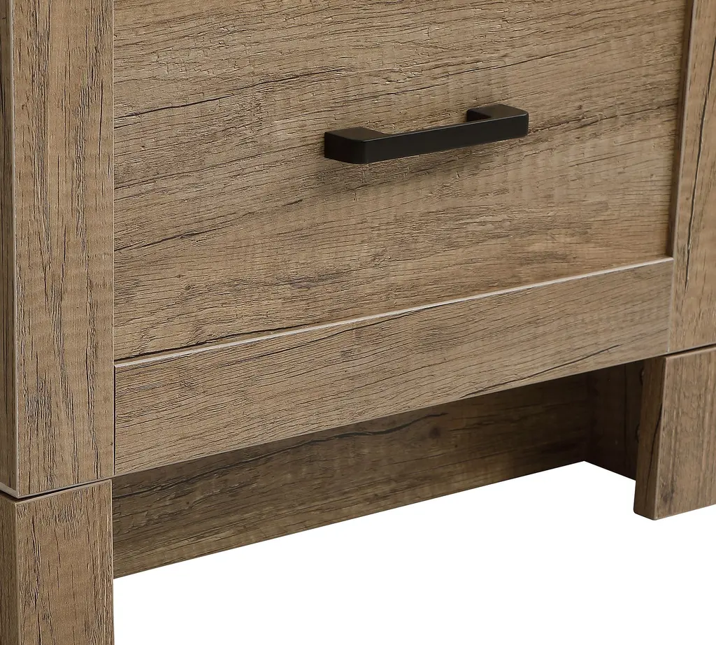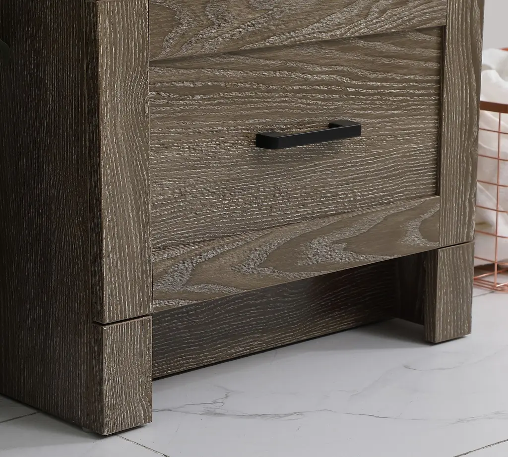 Clean lines and the warm look of wood lend a farmhouse feel to this vanity. Accented with pops of black for a modern edge, Alderson features the perfect amount of storage to keep all your essentials organized (even in smaller baths and powder rooms)